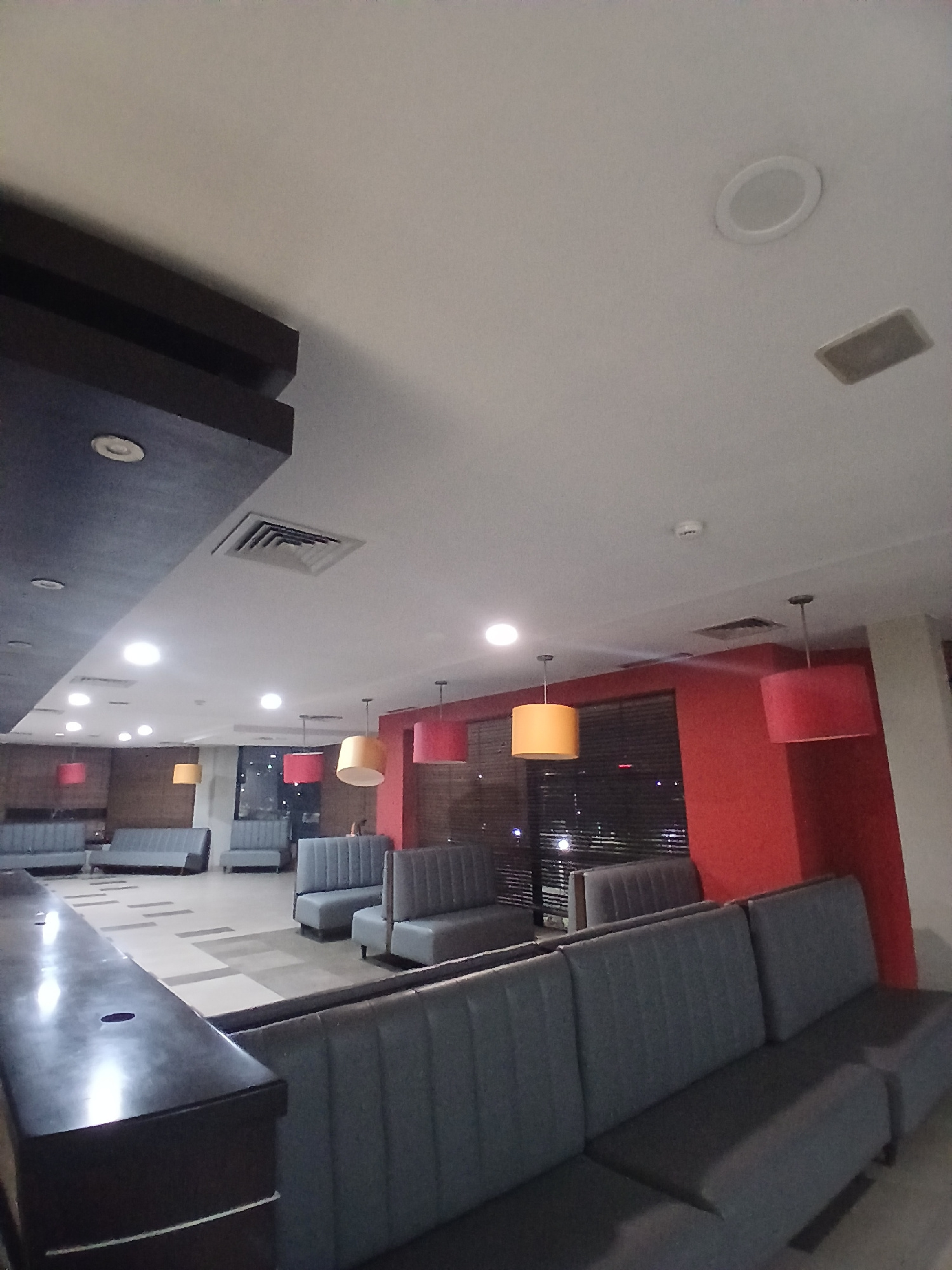 The image depicts an interior space, possibly a restaurant or lounge, in Meknes, Morocco. The scene is oriented vertically, showing a high-angle view. The ceiling is white with recessed lighting fixtu…read more