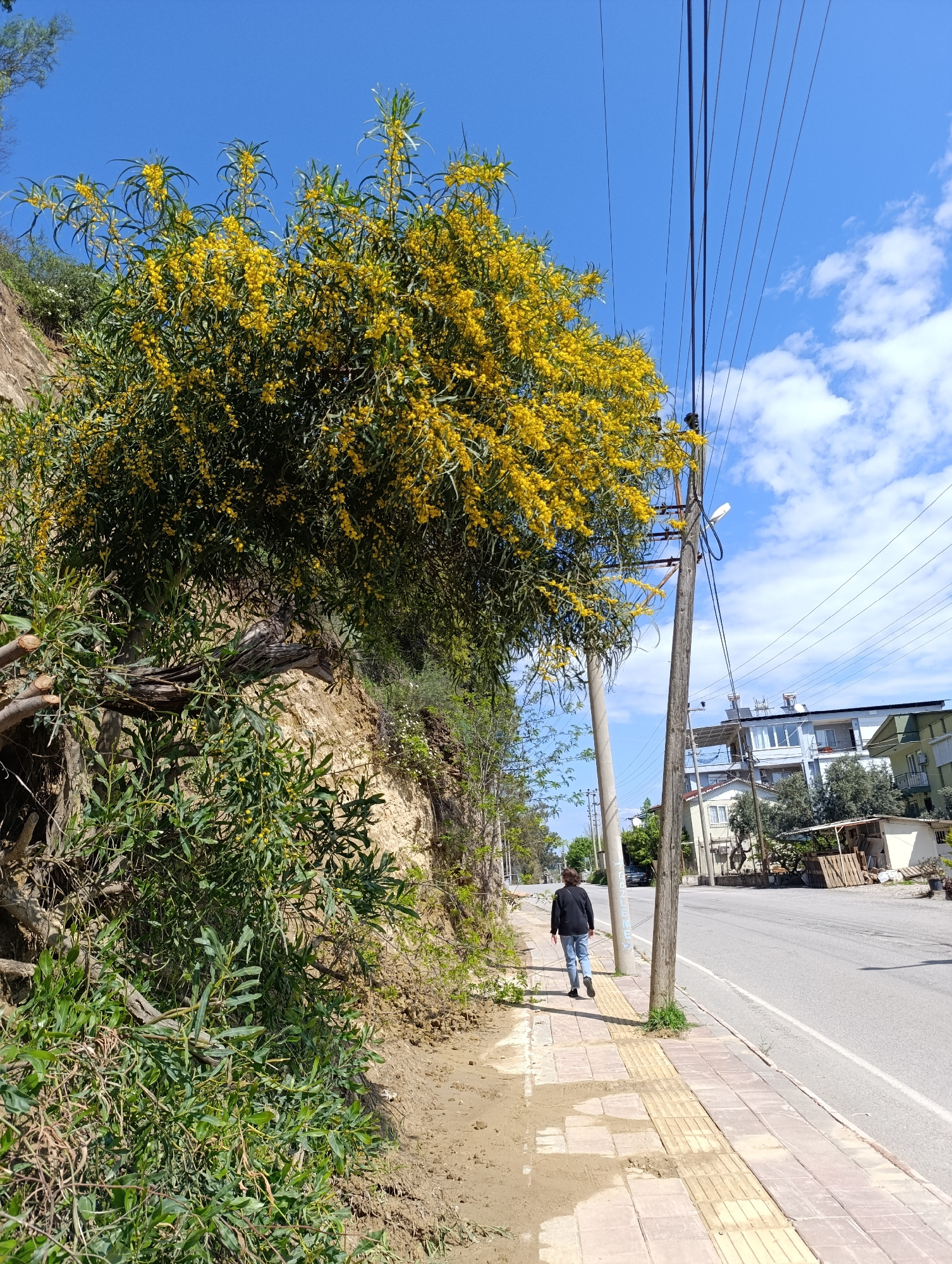 A medium shot depicts a street scene in Aksu, Turkey on a bright day with a clear, blue sky. A middle-aged person with short hair, clad in a dark jacket and blue jeans, walks away from the viewer alon…read more