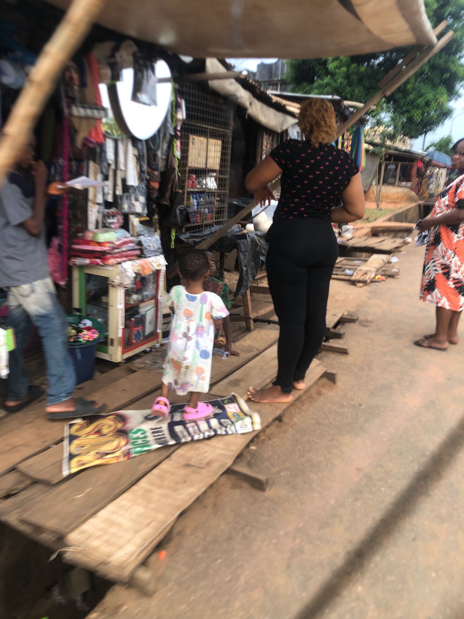 The scene is located in Ukwu-Abwa, Nigeria, appearing to be a street market environment. A woman in a black shirt with red flowers and black leggings is interacting with something behind a display. A…read more