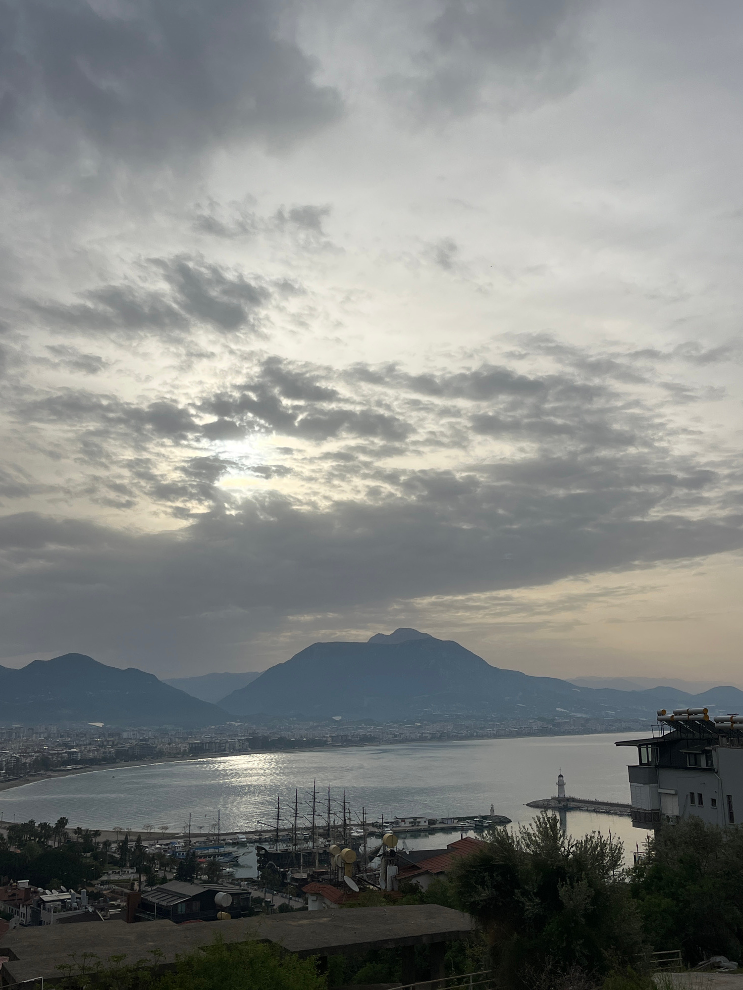 The image shows a view of the coastline in Alanya, Turkey. The scene is overcast with a sky filled with textured grey clouds obscuring the sun. A mountain range forms a backdrop to the city, running a…read more