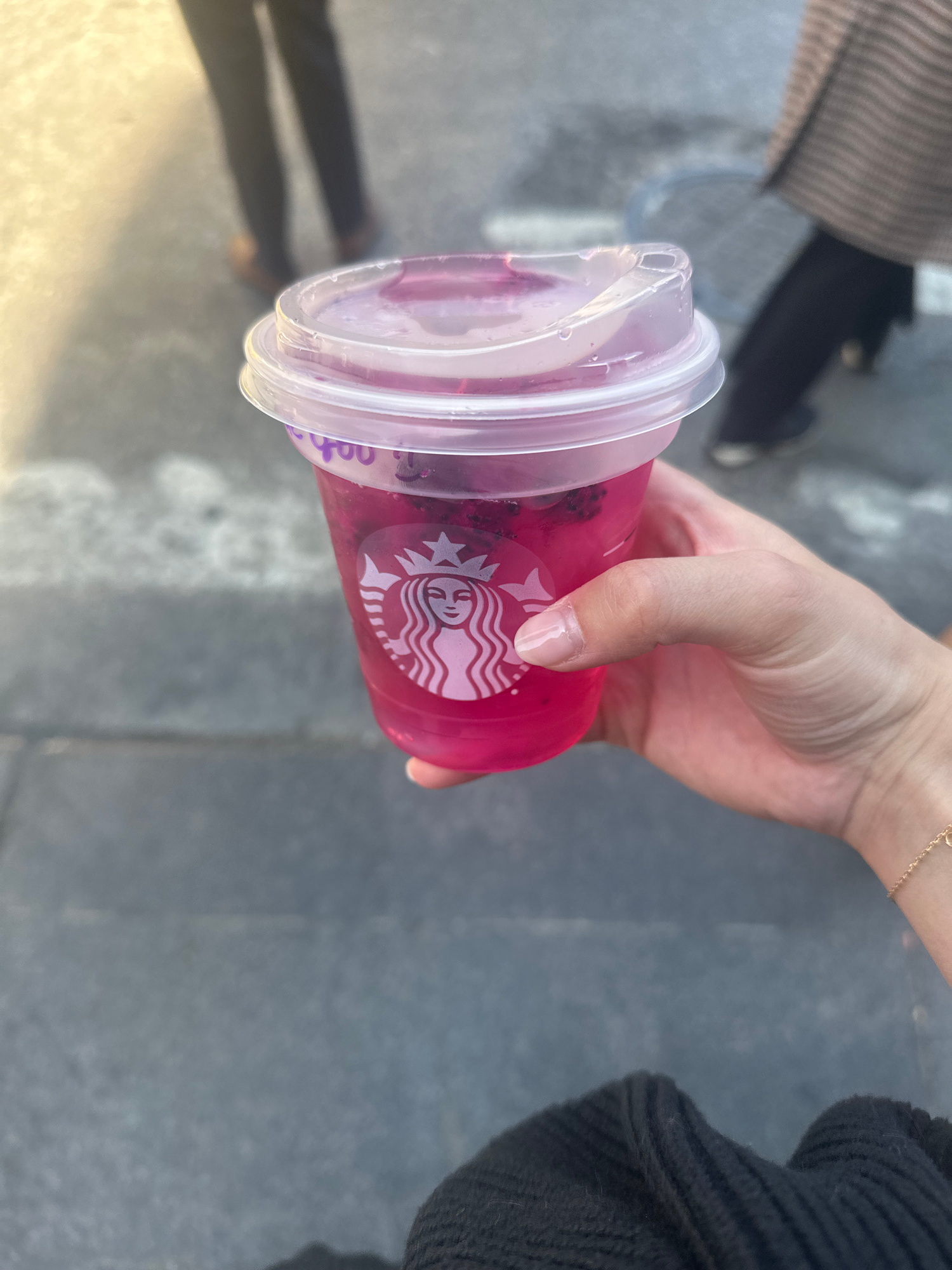 A person holds a Starbucks Dragonfruit Refresher in New York City. The drink is in a clear plastic cup with a translucent lid. The Starbucks logo is visible on the side of the cup. The person is weari…read more