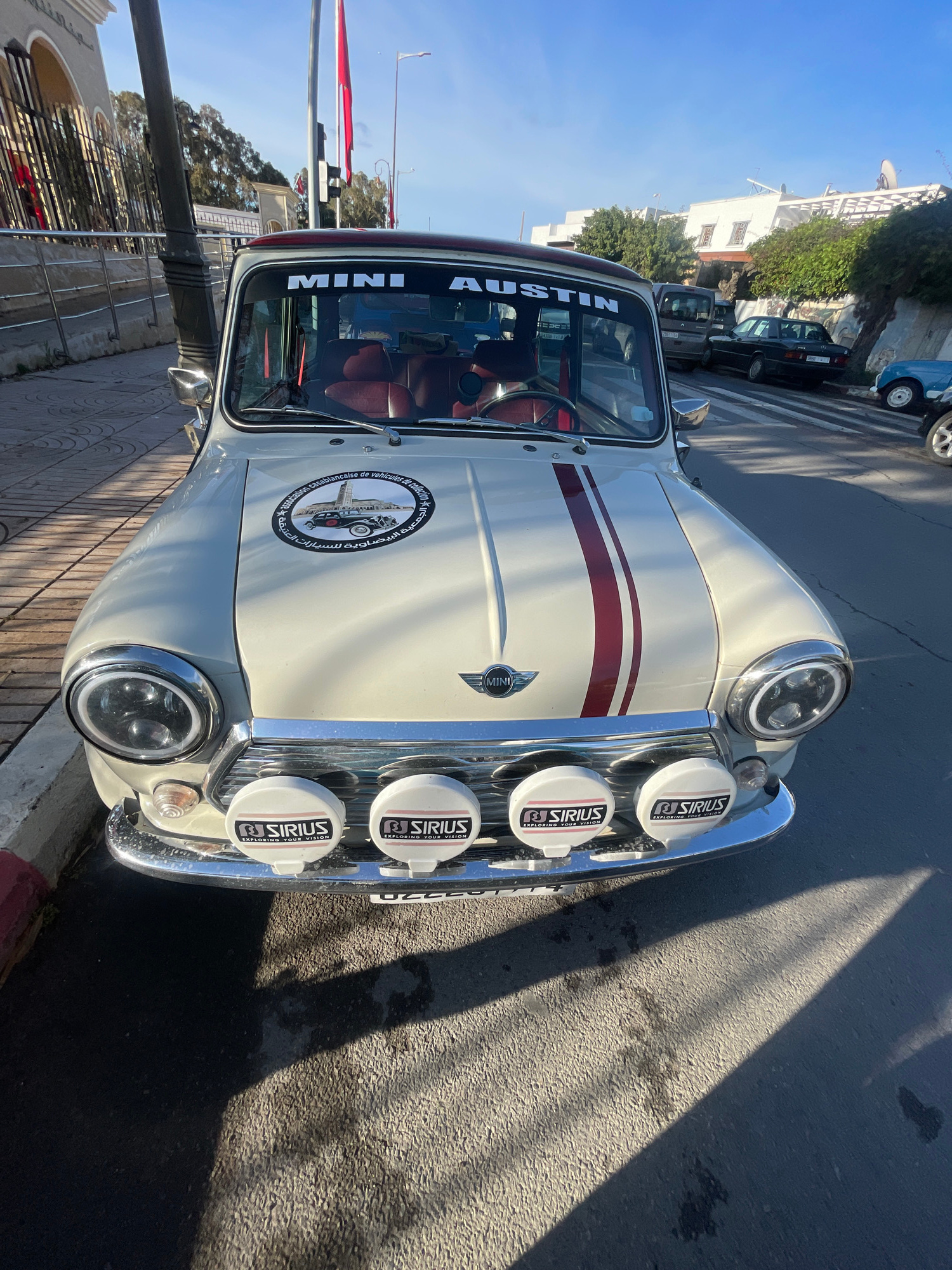 The image depicts a cream-colored Mini Austin car, modified with four auxiliary lights labeled "Sirius," parked on a street. The car features a red racing stripe and a sticker indicating the "Associat…read more
