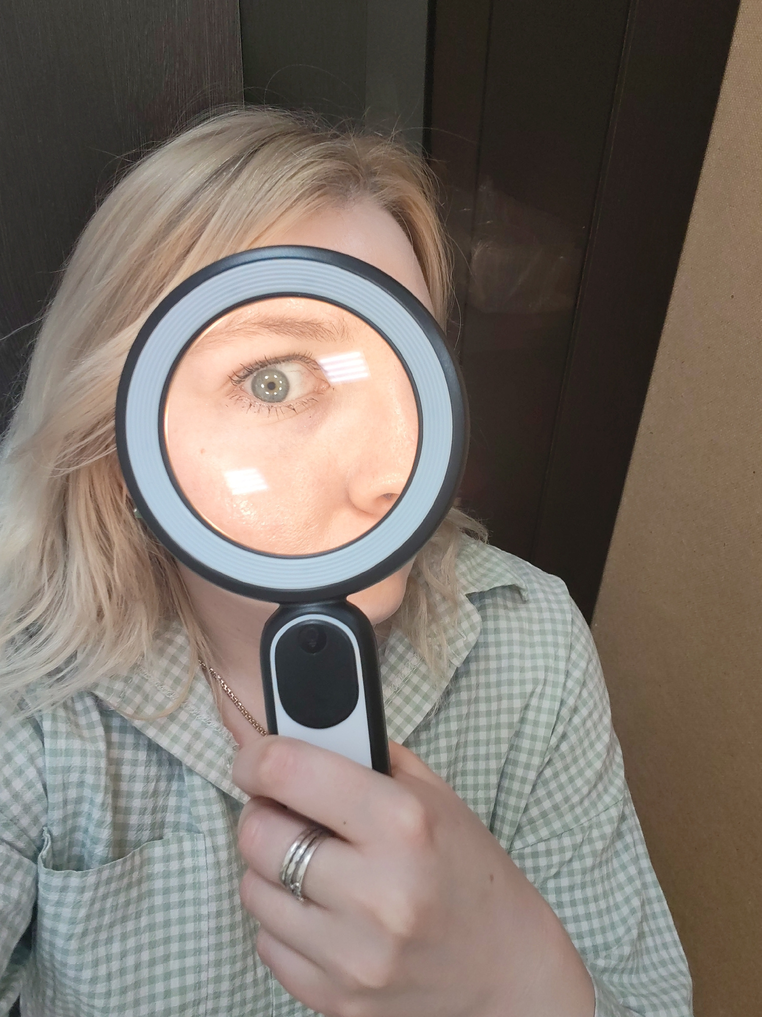 A person with fair skin and blonde hair is holding a magnifying glass up to their face, such that the glass frames their right eye and part of their nose and cheek. The person is wearing a light green…read more
