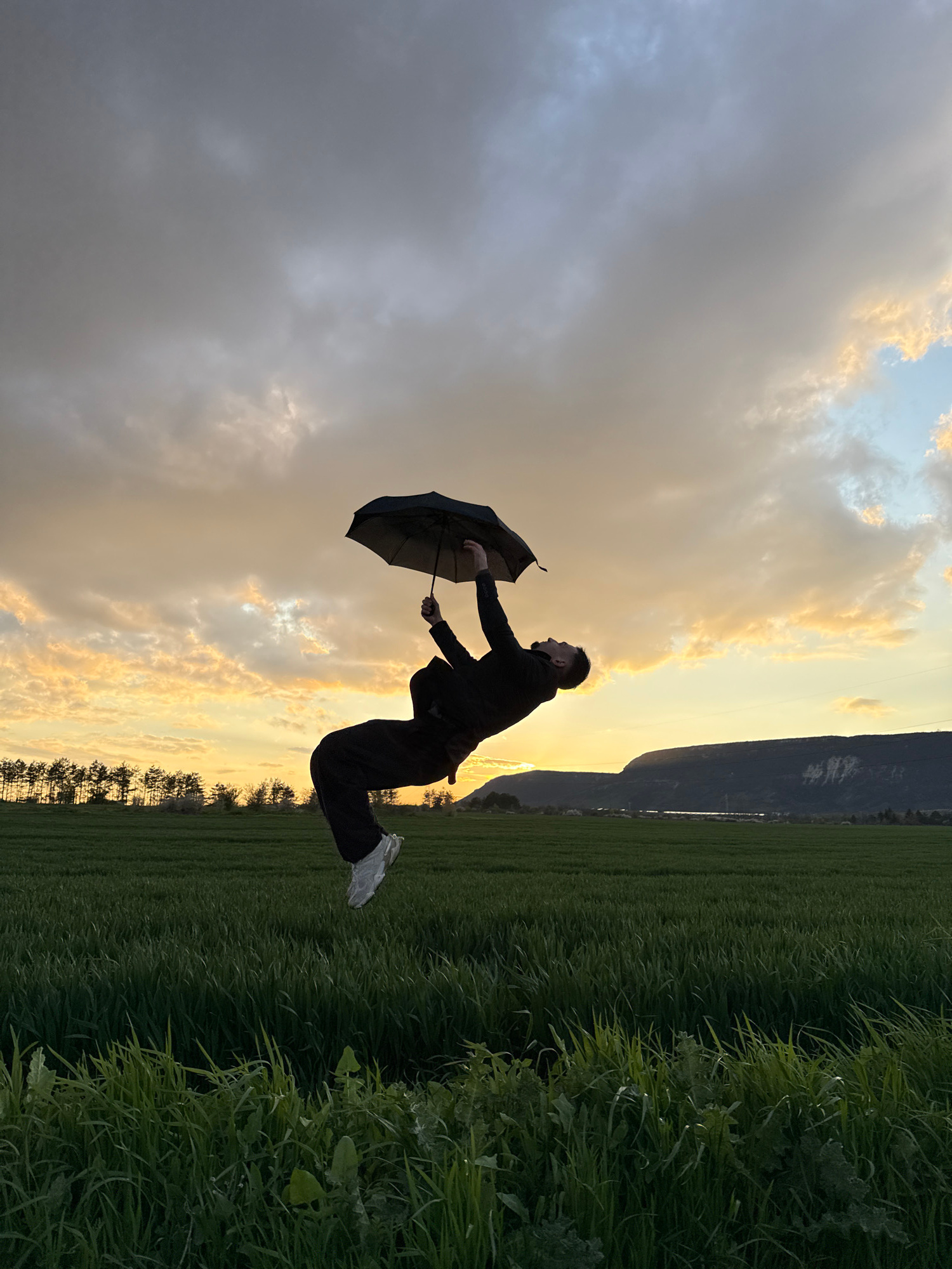 A man is leaping in a field, holding an umbrella. He is wearing dark clothing and white sneakers. The sky is filled with clouds at sunset. A mountain range is visible in the background. The location a…read more