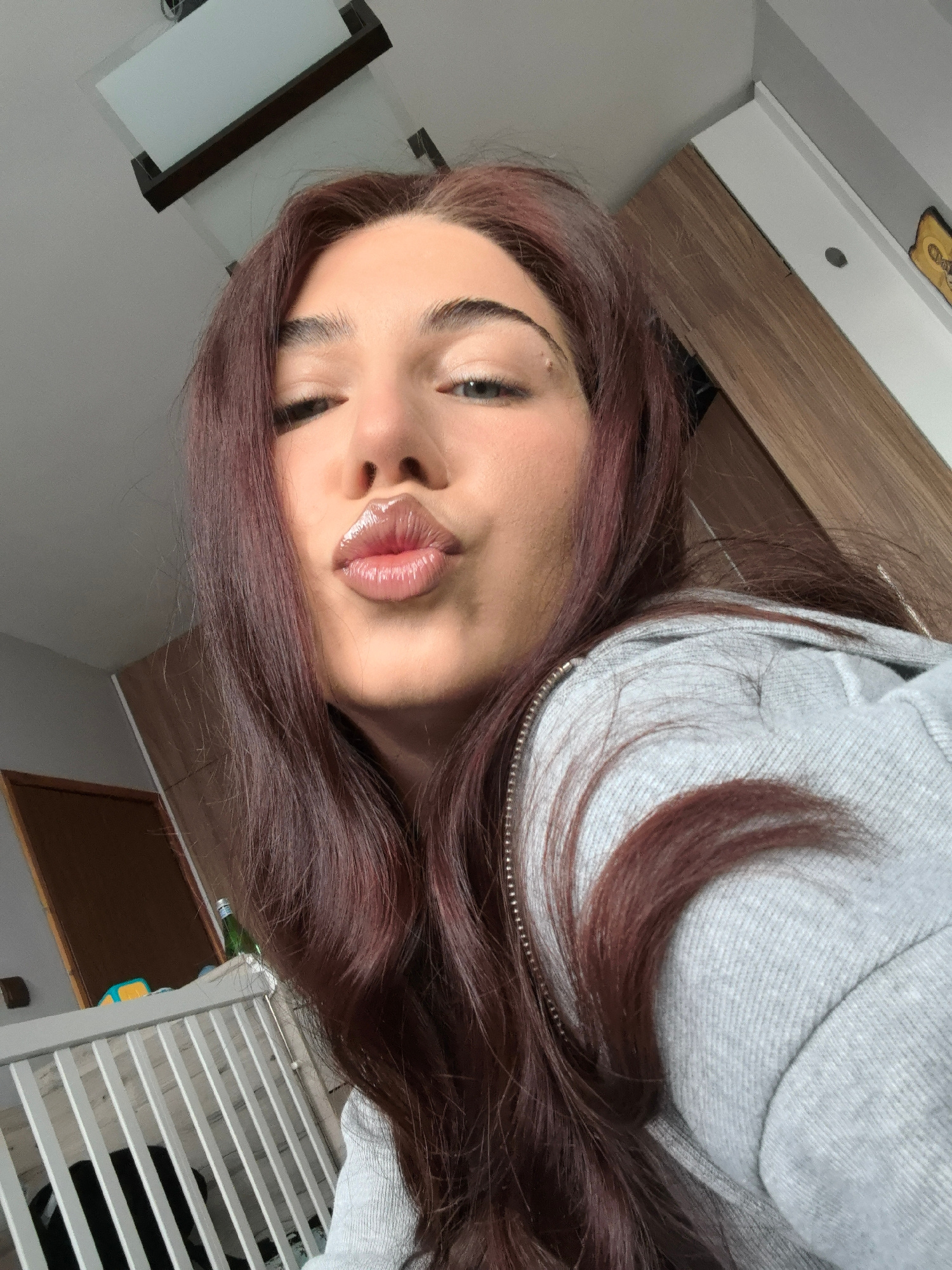 A young woman with long, auburn hair is posing for a selfie. She has fair skin, dark eyebrows, and full lips with clear lip gloss, and she is making a kissing face. She is wearing a light gray hooded…read more