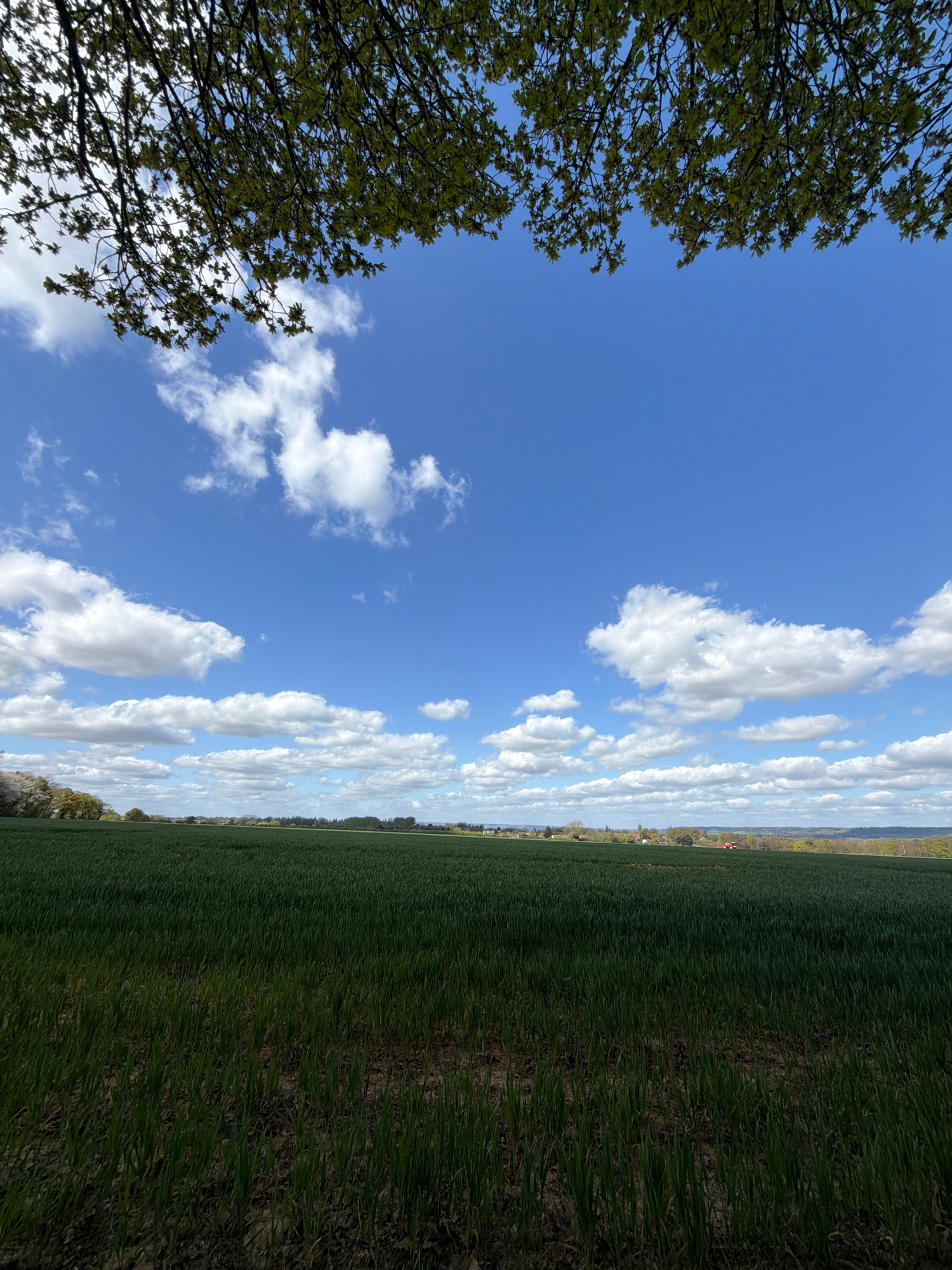 A landscape photograph taken in daylight shows a field of green crops on the right, a blue sky with white clouds in the center, and tree branches with green leaves on the left. In the distance on the…read more