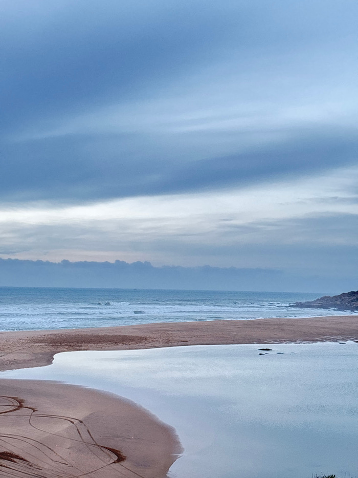 A landscape photograph presents a vast beach under a predominantly cloudy sky. The sky, encompassing roughly half the image, displays varying shades of blue and gray, hinting at overcast conditions. A…read more