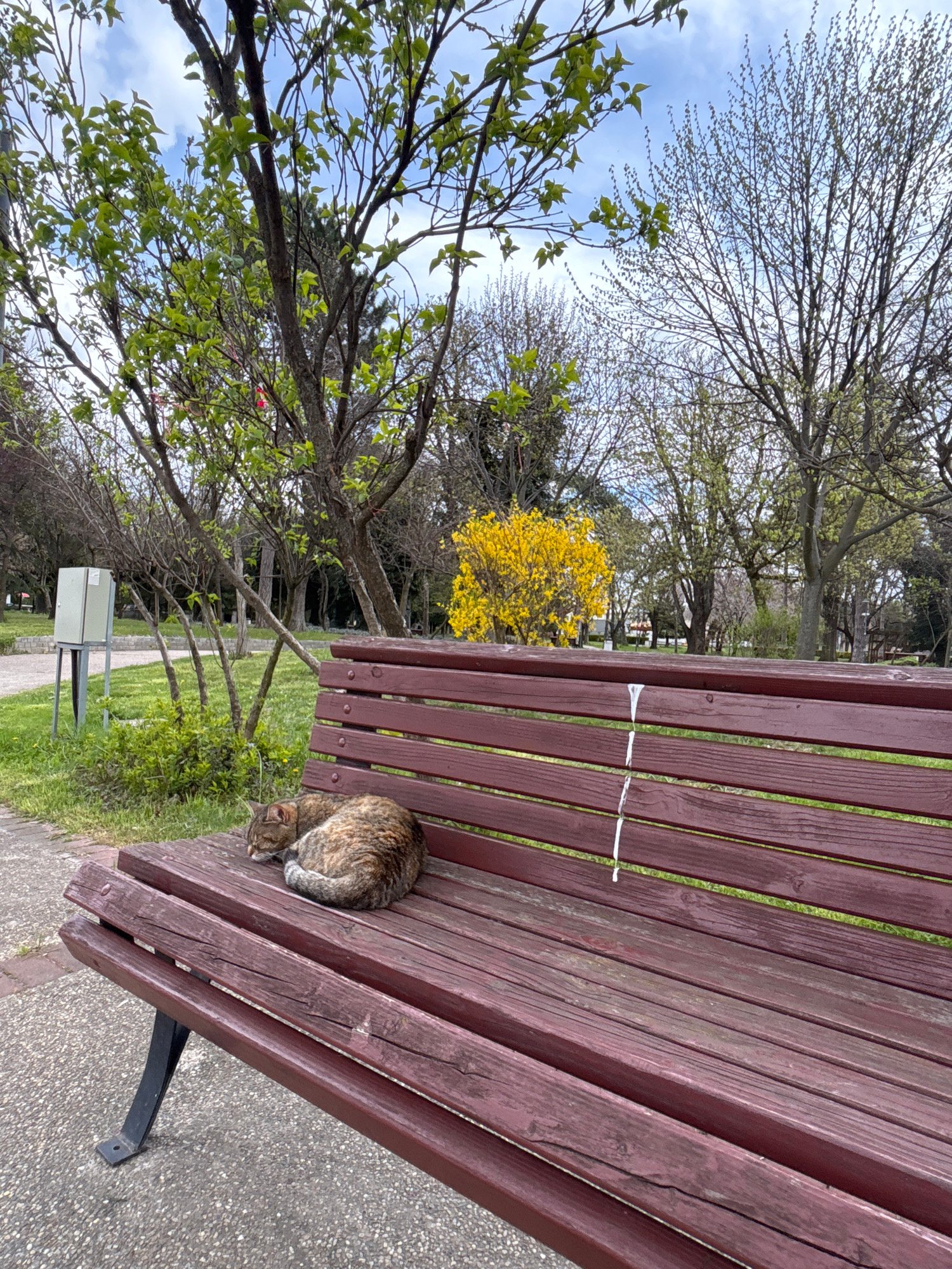A cat is curled up on a wooden bench in Silistra, Bulgaria. The bench is red-brown in color and has a black metal support. A white string is on the bench. A park is in the background with grass, treesβ¦read more