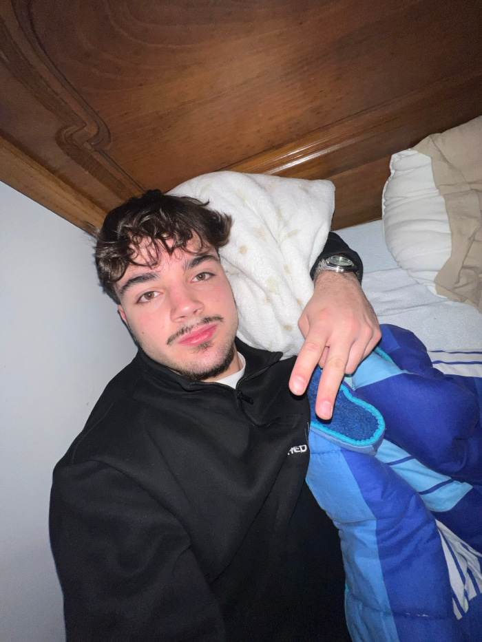 A young adult male is depicted lying in a bed in an indoor setting, presumably a bedroom, within the city of Bragança, Portugal. He has short, curly dark hair, a mustache, and a chin strap beard. His…read more