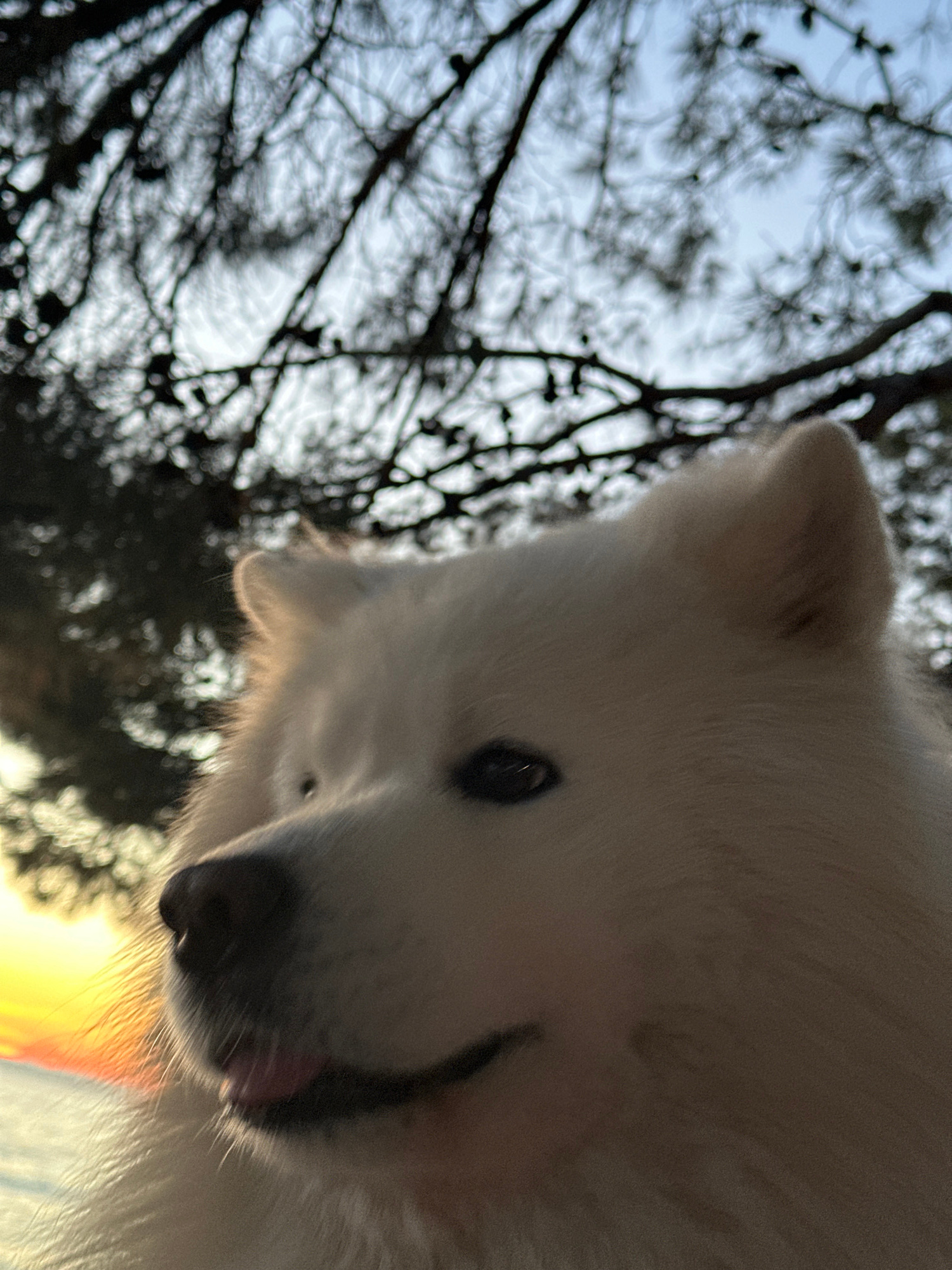 A close-up, low-angle shot focuses on a fluffy, white dog, likely a Samoyed, with its face dominating the frame. The dog's black nose is prominent, with a hint of its tongue visible. One eye is clearl…read more