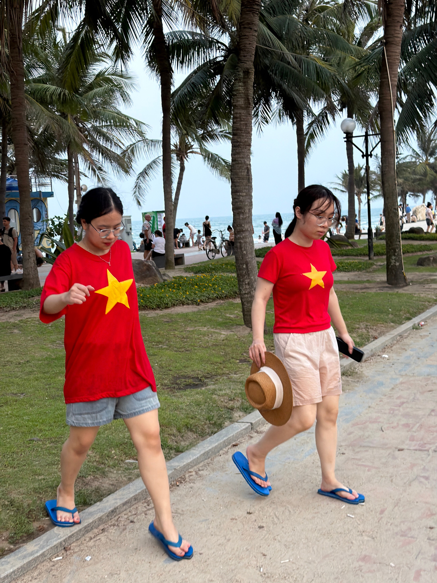 Two women, one wearing glasses, stand on a concrete path next to a grassy area, with palm trees lining the background. They are both wearing red t-shirts with a yellow star, a symbol of Vietnam. The w…read more