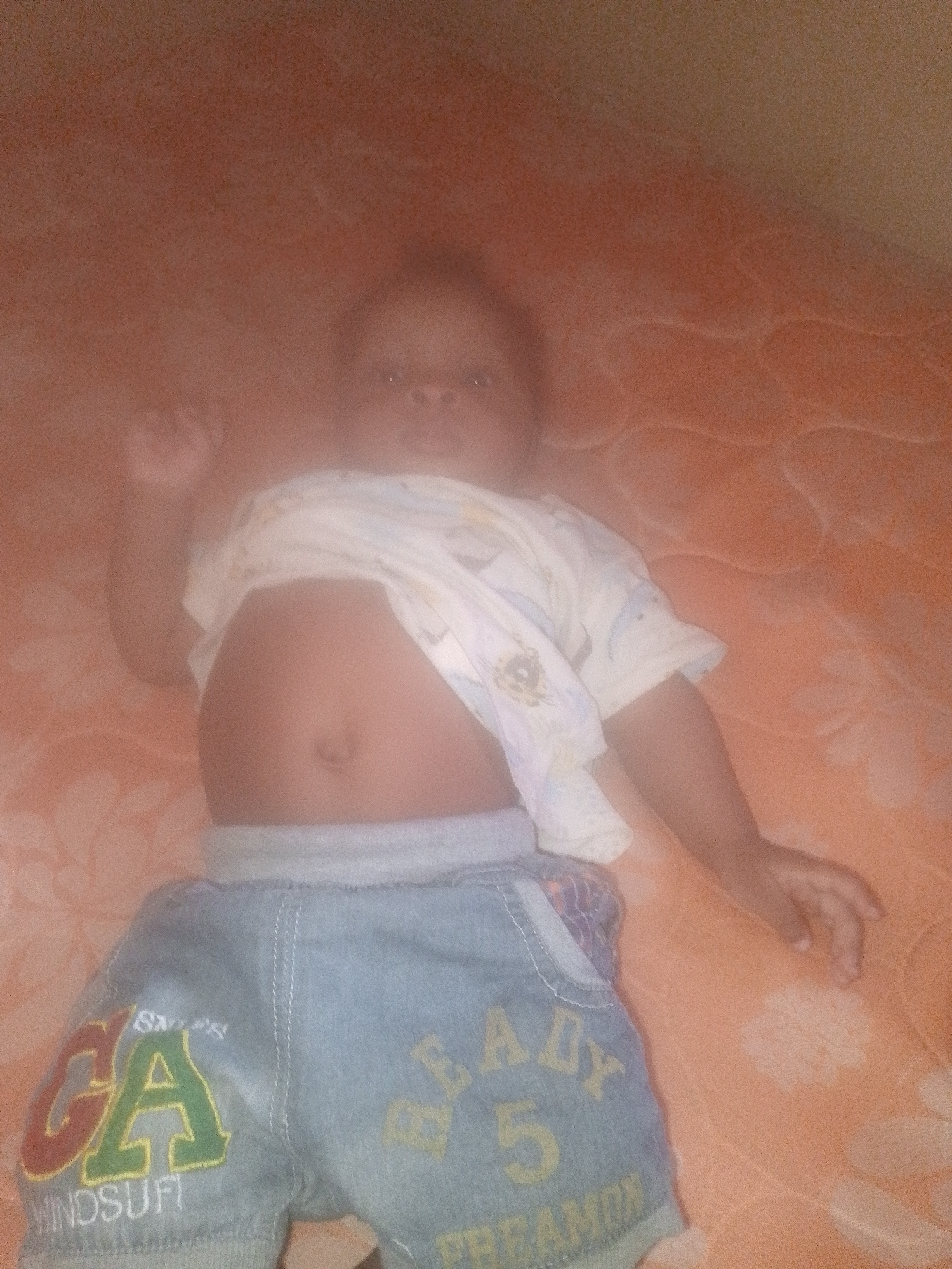 A baby lies on an orange patterned surface. The baby wears light denim shorts with the letters "CA" and "READY 5" printed on them. The baby's shirt is slightly raised, revealing their stomach. The env…read more
