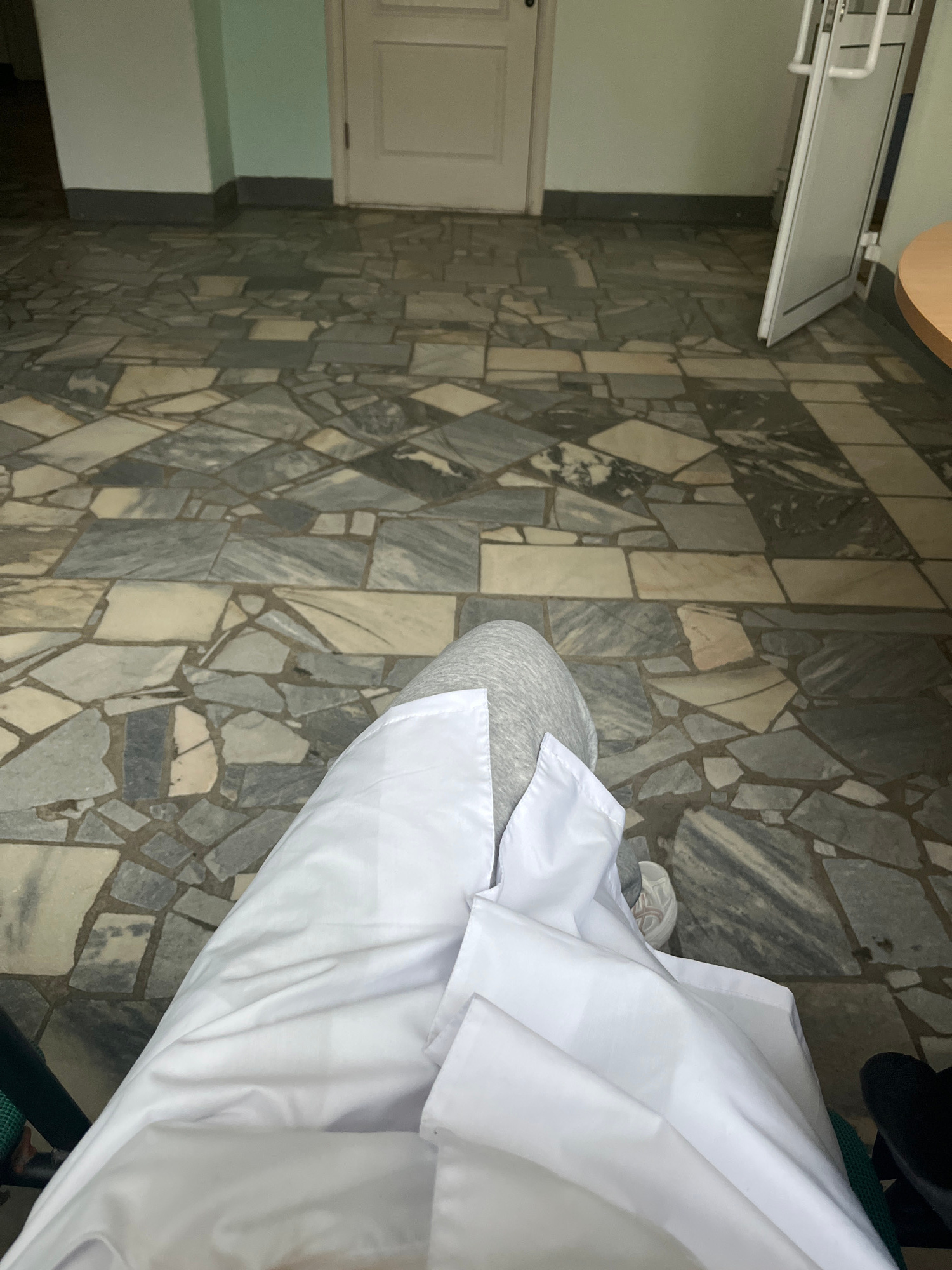 The image shows an indoor scene with a tiled floor and a white object, possibly bedding, placed on it. In the background, there's a white cabinet or door, and what appears to be a lighting fixture. Thβ¦read more