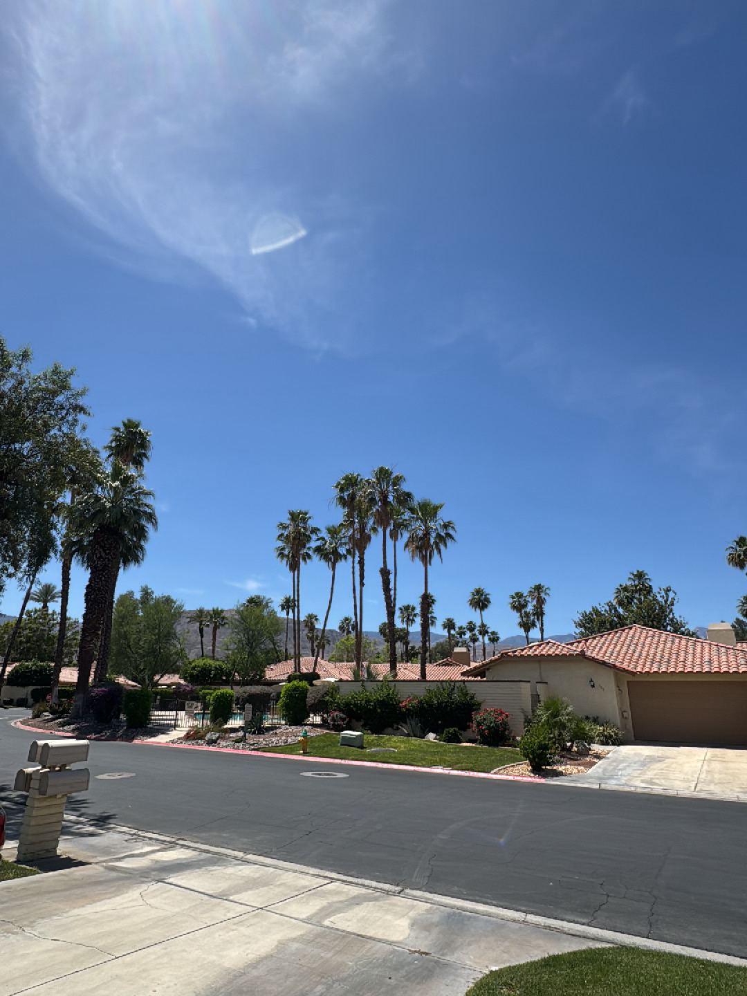 The image captures a residential street in Palm Desert, United States, under a clear blue sky with scattered clouds. Palm trees of varying heights line the street, defining the landscape. The houses h…read more