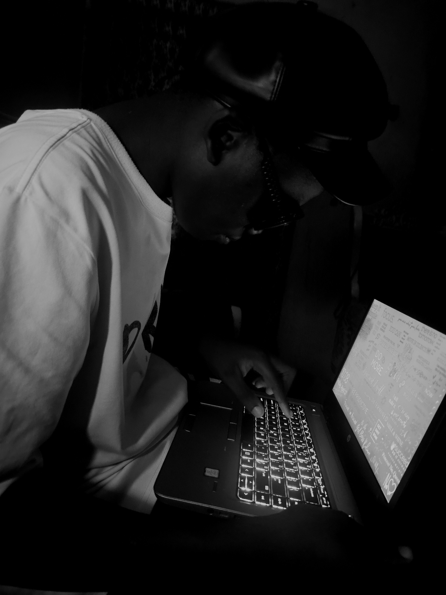 A person is lying down and using a laptop. They are wearing a cap and sunglasses, and a light-colored t-shirt. The laptop screen has inspirational words on it. The keyboard is backlit. The environment…read more