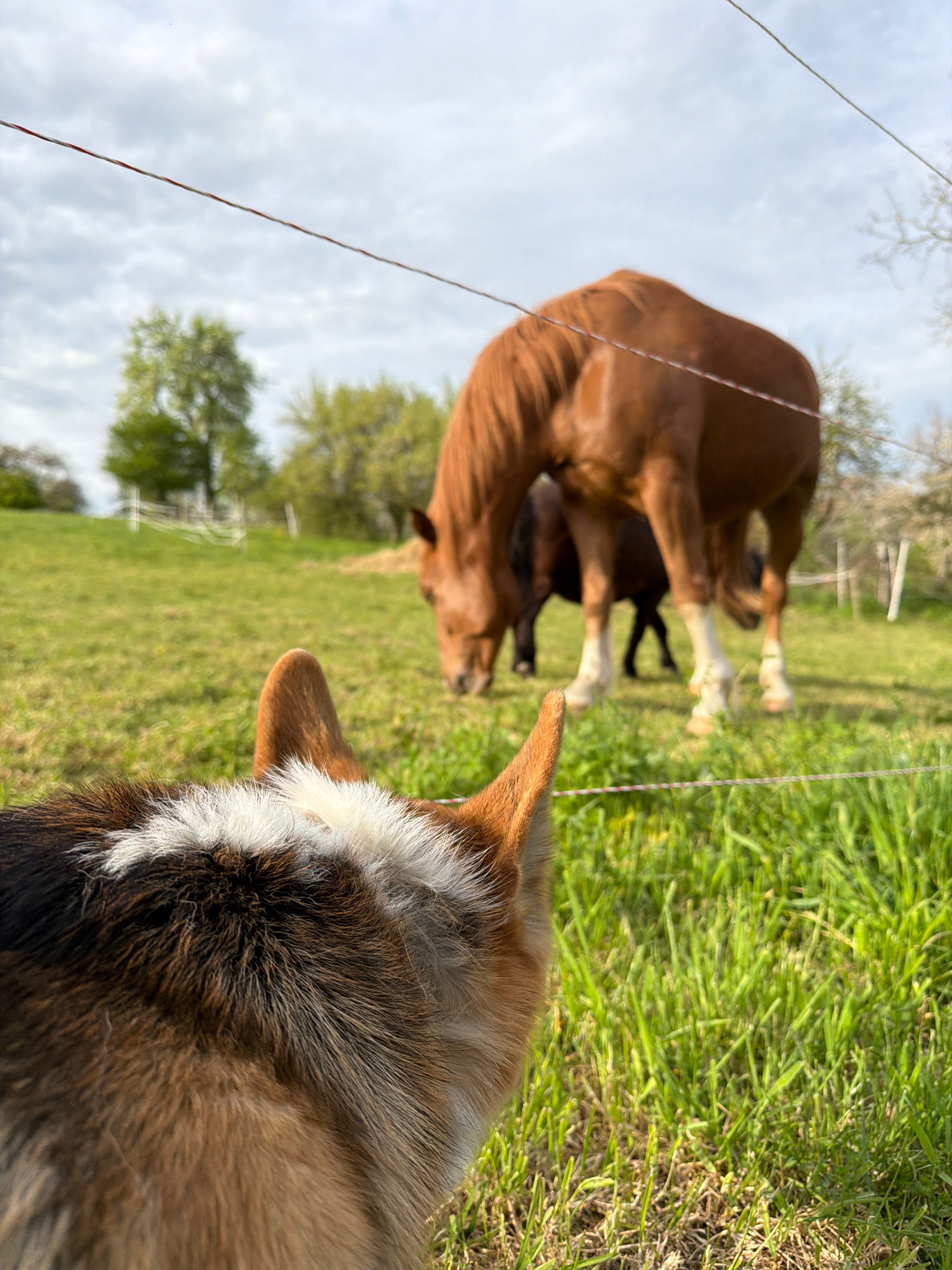 The scene depicts a grassy field in Gangloff, Germany, where two brown horses stand beyond a wire fence. A dog's head, with brown and white fur, is positioned close to the foreground of the image. The…read more