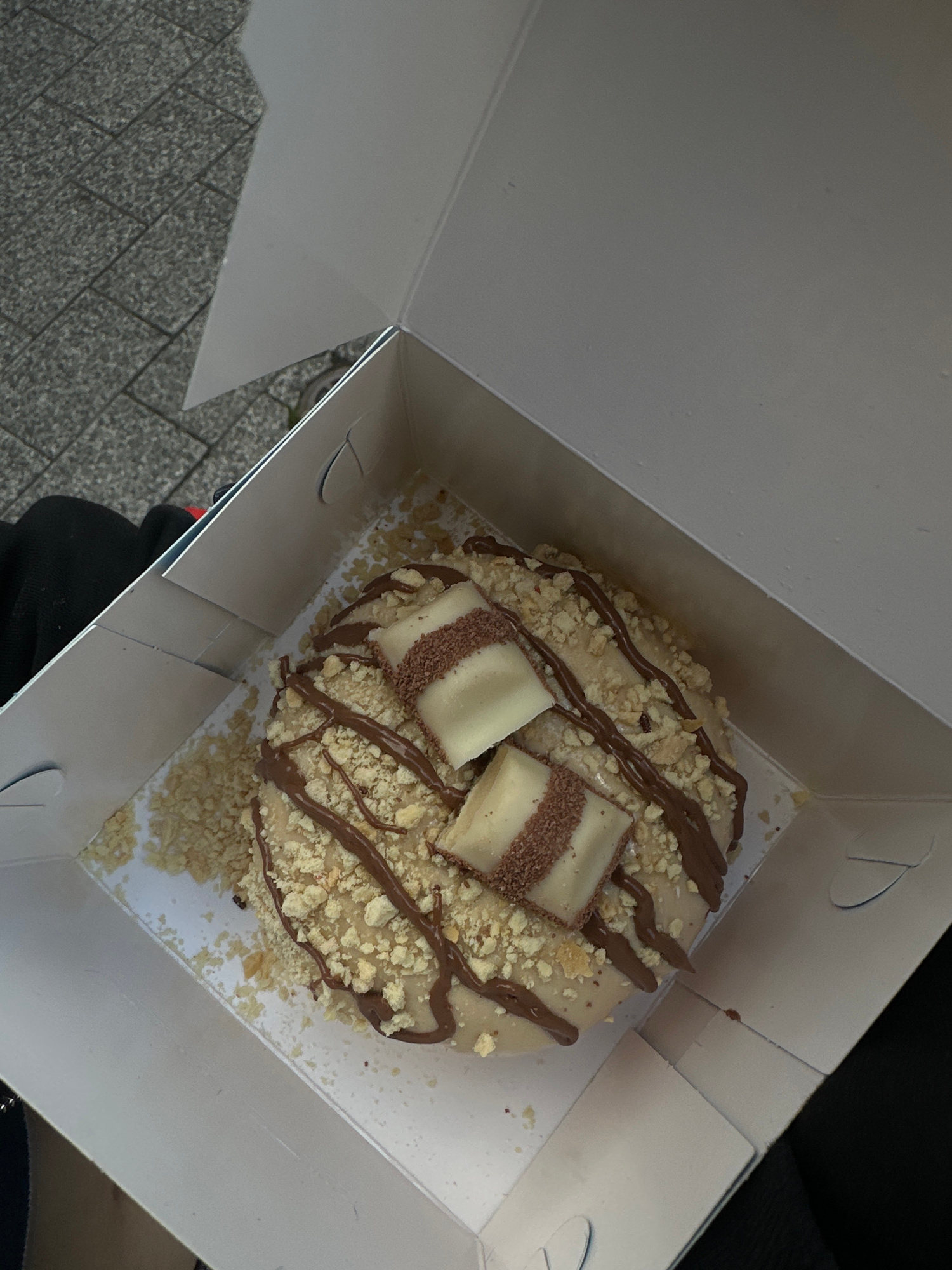 A donut is situated in an open white box. The donut has a light-colored glaze, crushed nuts, and chocolate drizzle, with two Kinder Bueno candy pieces placed on top. The box is sitting on what appears…read more