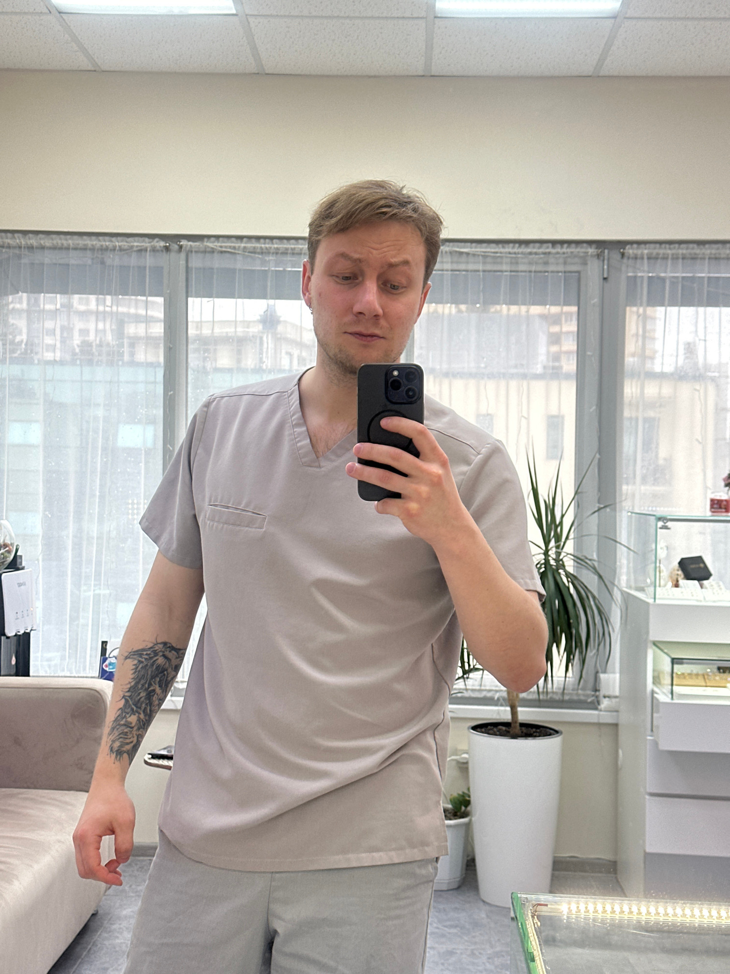 A man with short blonde hair is taking a selfie in a mirror. He is wearing a light grey scrub top and matching pants. The man has a tattoo on his left forearm. He is holding a black smartphone in his…read more