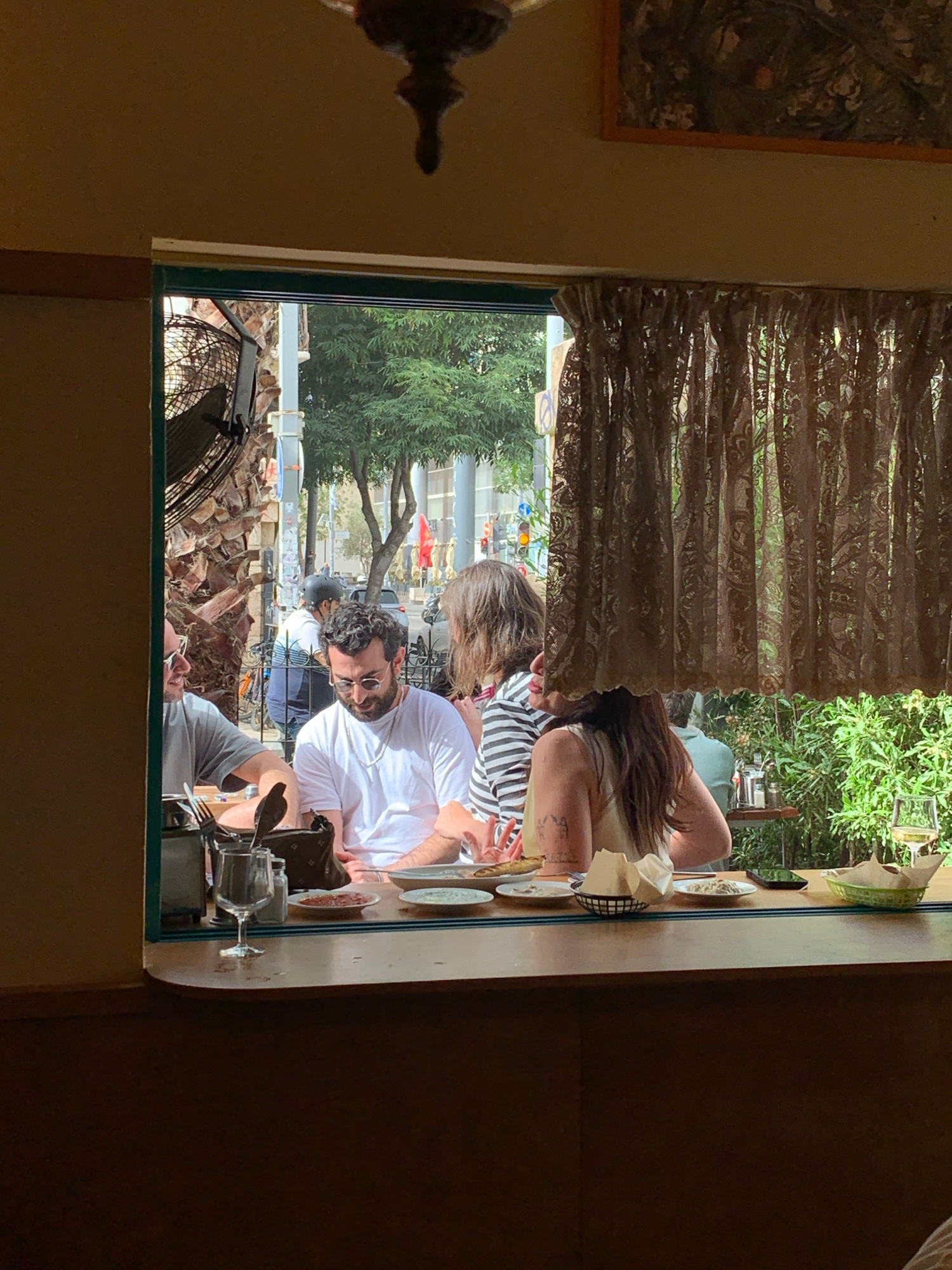 Captured through a window, the image shows a group of people dining outdoors at a restaurant. The scene seems to be in Tel Aviv, Israel, evidenced by the surrounding foliage and urban layout. The din…read more