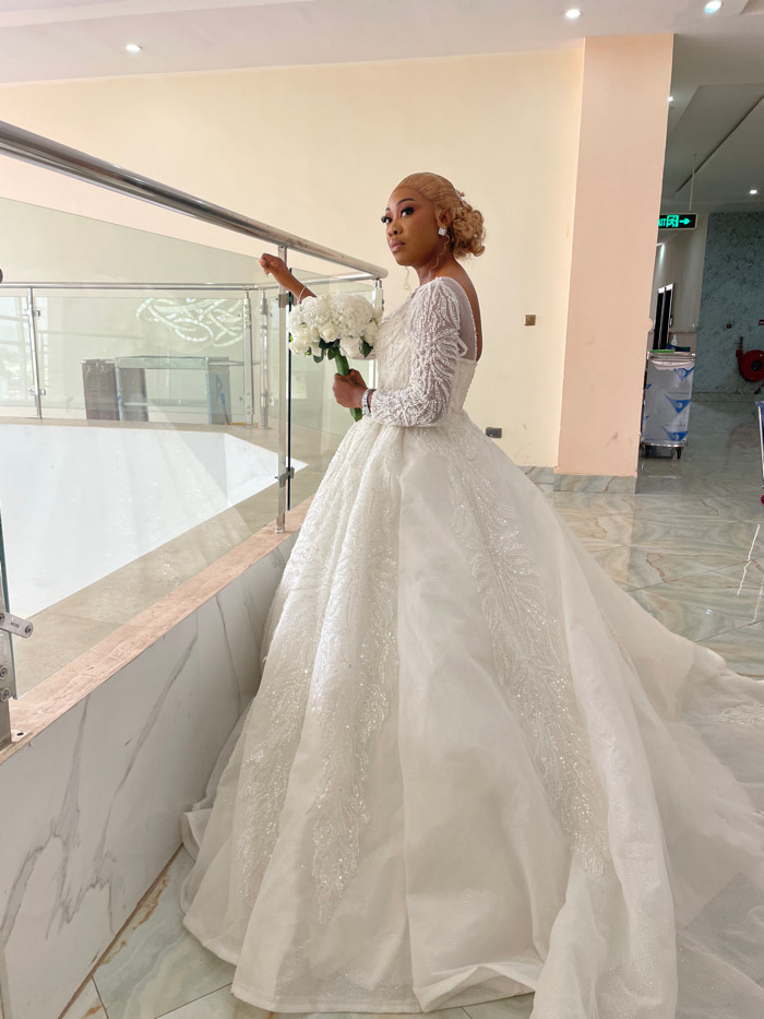 The image portrays a female subject in a formal white wedding gown, situated indoors within a multi-level building in Barakin Lerawi, Nigeria. The woman stands facing slightly left, her right hand res…read more