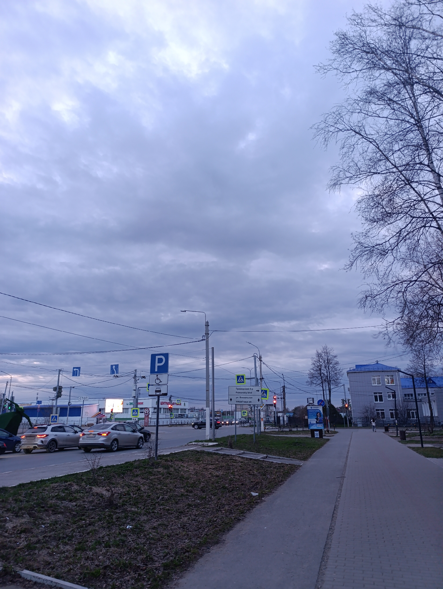 The image depicts a street scene in the city of Chaikovsky, Russia. The sky is overcast with gray clouds, suggesting a cool or potentially rainy day. In the foreground, there is a sidewalk made of gra…read more