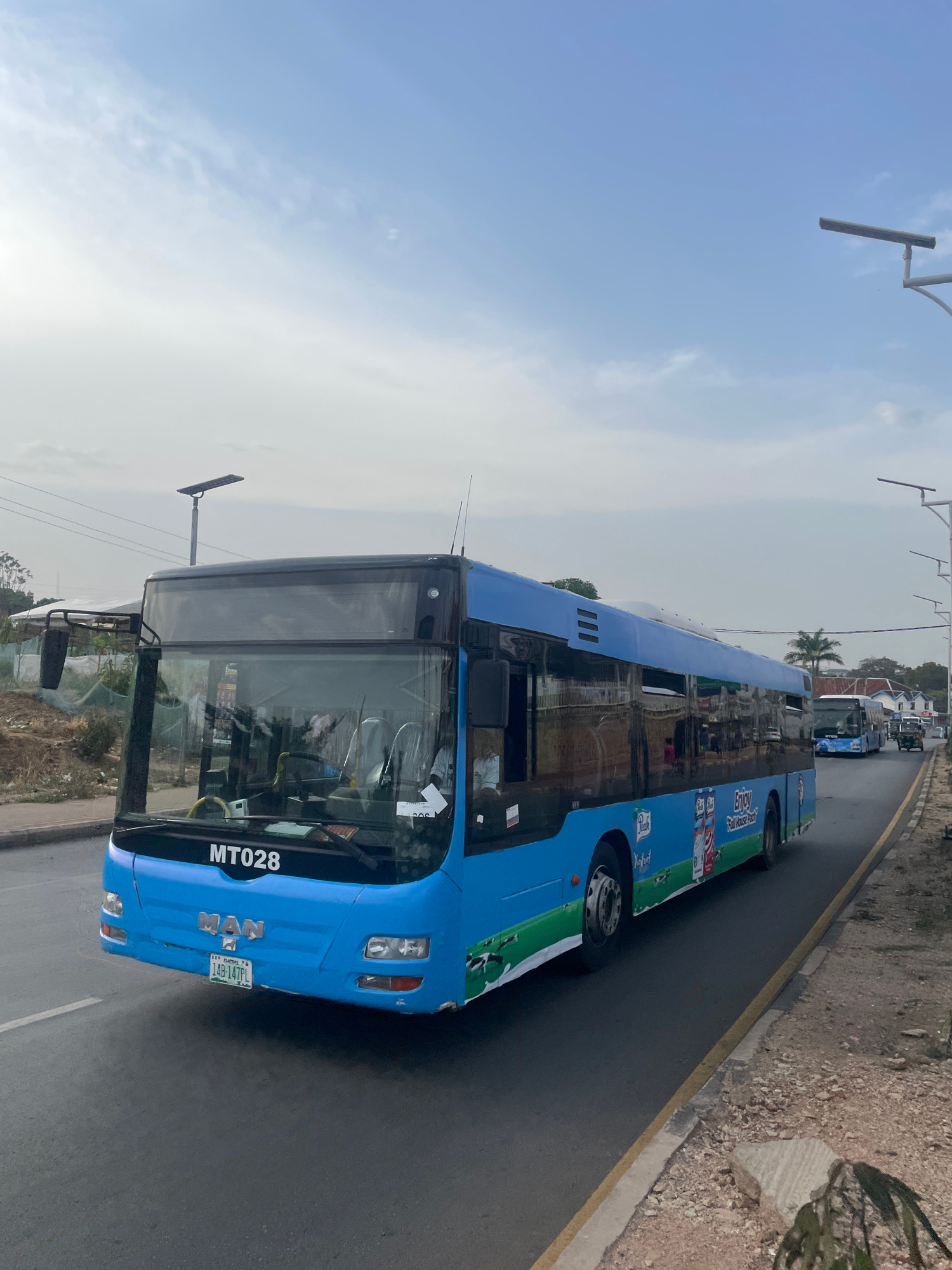 The image shows a blue MAN city bus, with the registration number "MT028," on a paved road in Jos, Nigeria. The bus is adorned with advertisements for "Enjoy Full Cream Milk" on its side. In the backg…read more