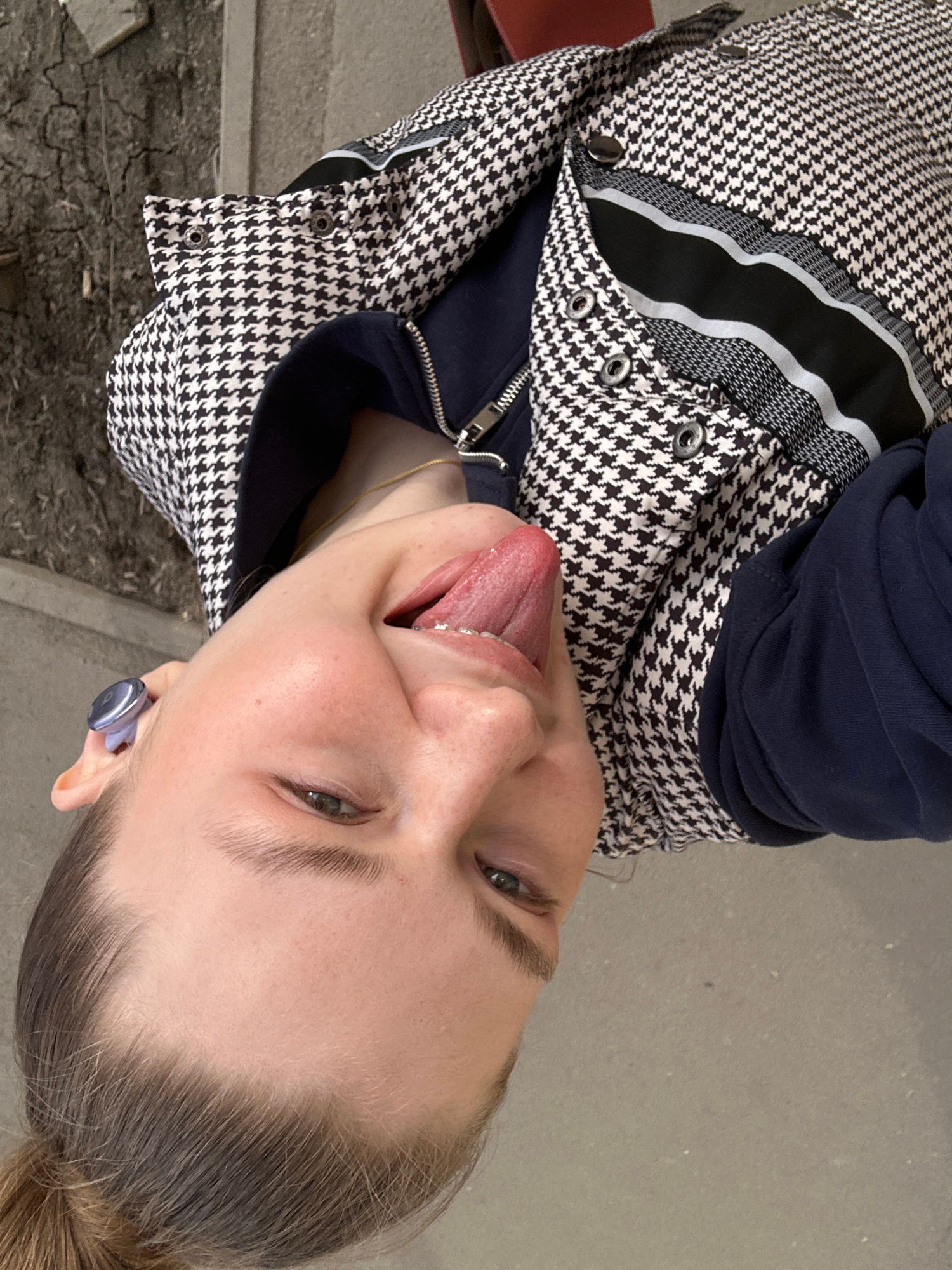 A young woman is photographed outdoors, likely in Kazan, Russia, given the image's location data. She is angled slightly to the right, sticking her tongue out, with braces visible on her lower teeth.…read more