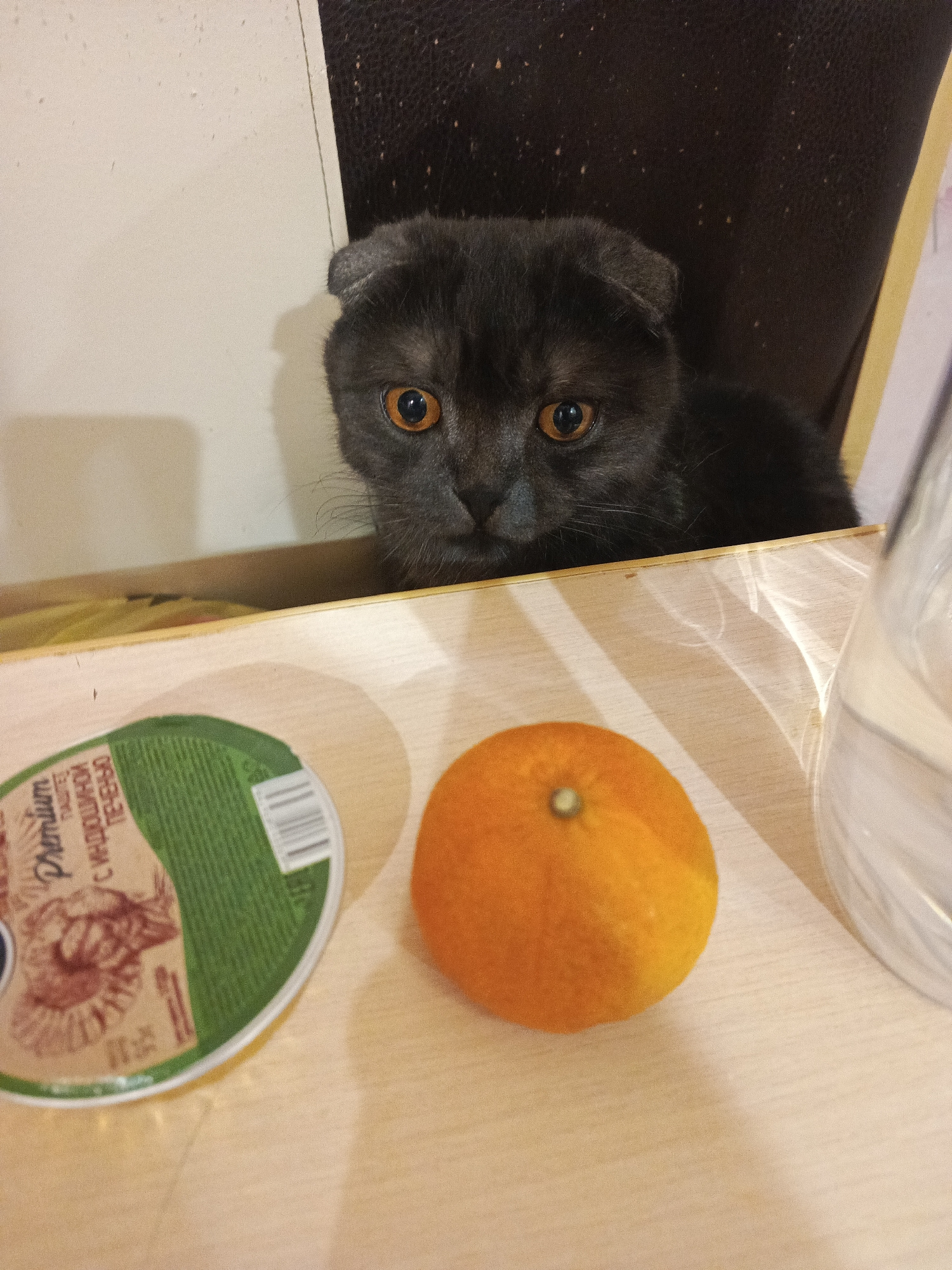 A gray Scottish Fold cat with orange eyes peeks over the edge of a wooden table. On the table, to the left of the cat, is a container of "Premium" paste. Next to the paste is an orange and part of a w…read more