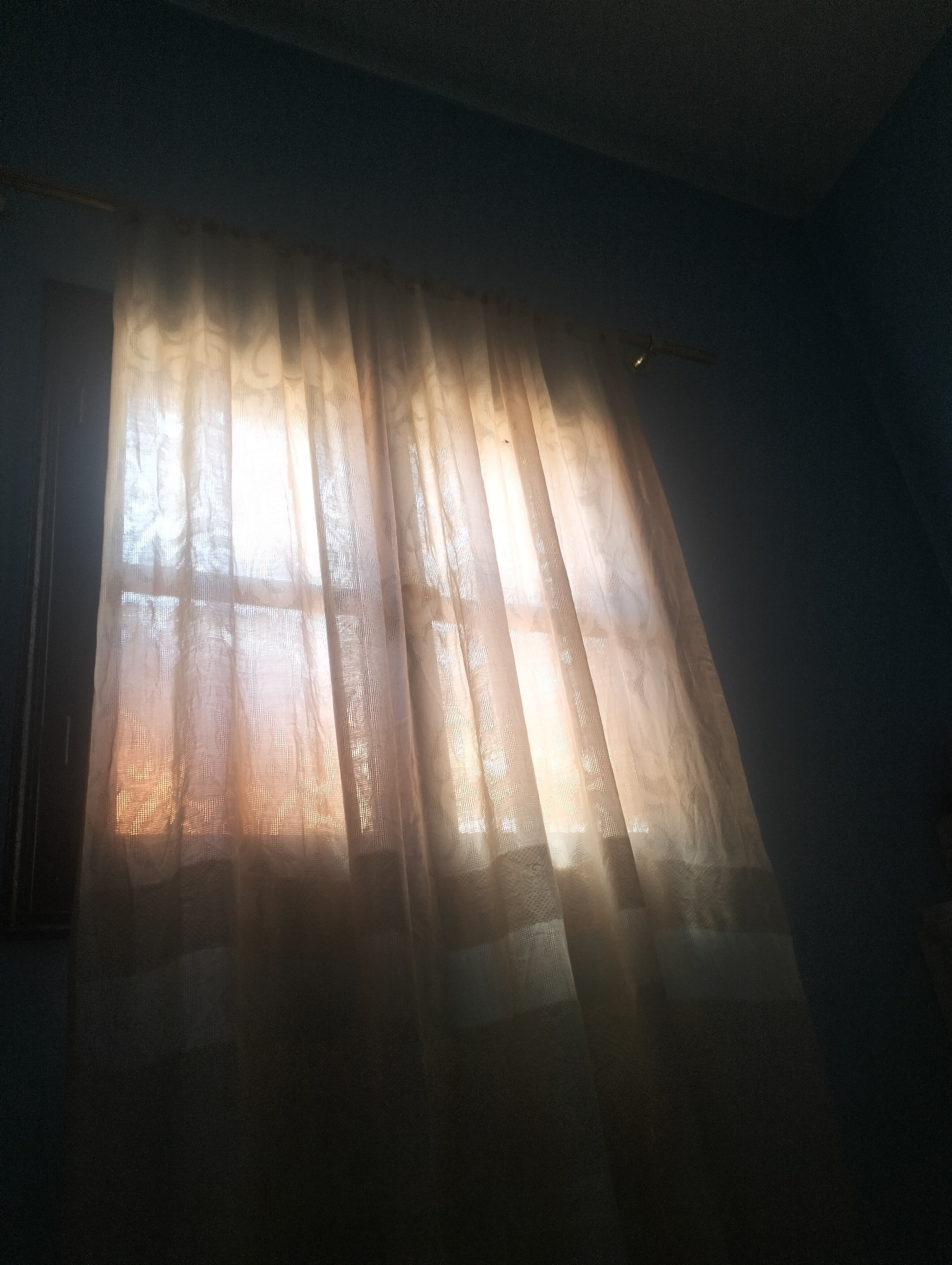 The scene depicts an interior room in Ouaouizert, Morocco, featuring a window covered by translucent, cream-colored curtains. Bright natural light, appearing warm and orange-yellow, strongly illuminat…read more