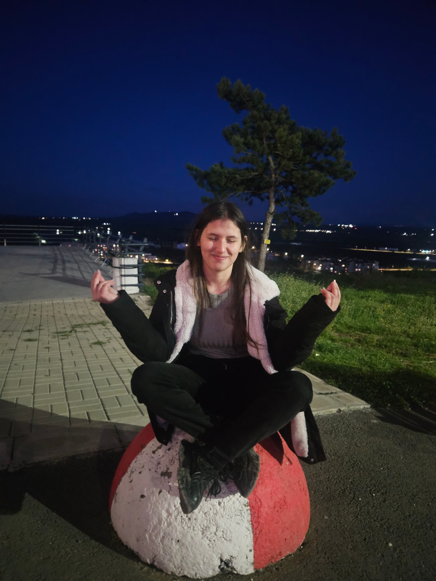 A young woman sits cross-legged atop a red and white painted bollard. She wears a black jacket with a white furry lining, gray shirt, and black pants and shoes. The setting is an outdoor public space…read more
