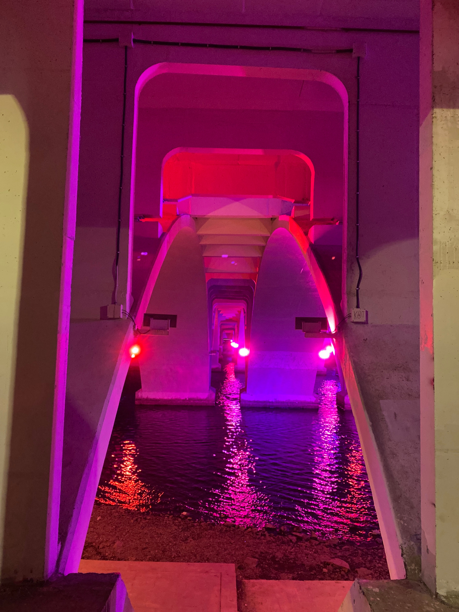 An eye-level, upward-angled shot features a concrete waterway under a bridge in Yekaterinburg, Russia. The waterway contains flowing water that reflects pink and purple lighting. The surrounding concrβ¦read more