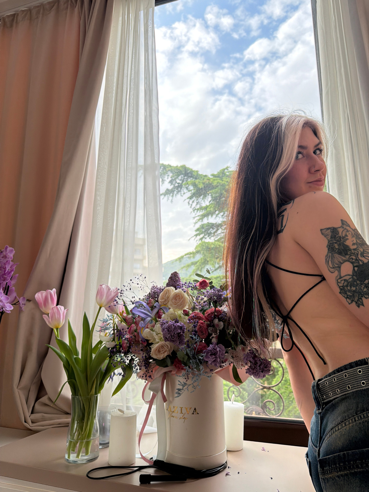 A portrait-style photograph captures a woman posing indoors by a large window, surrounded by floral arrangements. The woman, with long dark hair featuring blonde highlights, is turned away from the ca…read more