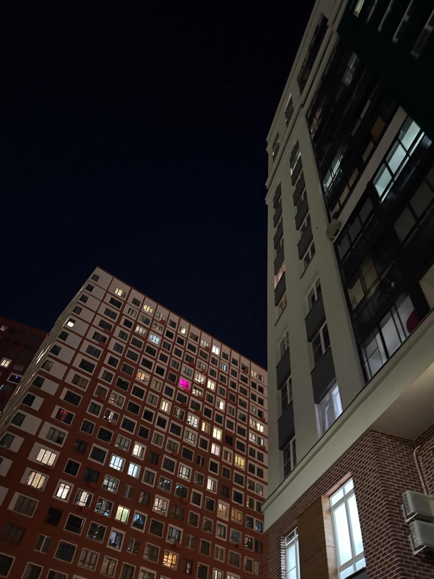 The image shows a low-angle view of buildings at night. On the right, a reddish-brown building with a grid pattern of windows is visible. Many windows are illuminated. One window emits a magenta ligh…read more