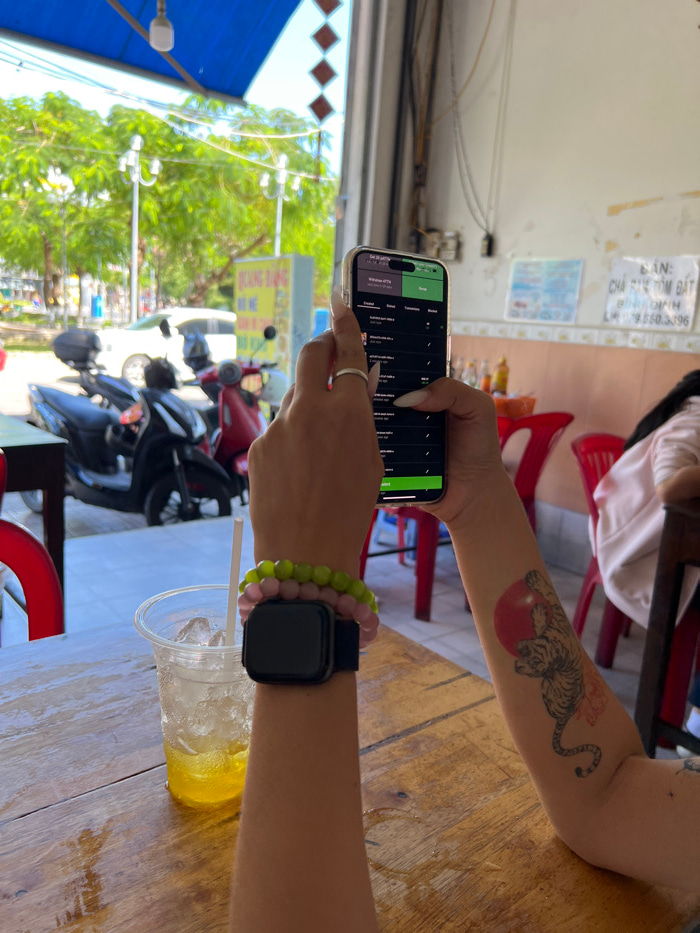 A person sits at a wooden table with a drink, looking at their phone. The phone displays a list of items. A smartwatch and colorful beaded bracelets adorn the person's wrist. A tattoo of a tiger sitti…read more