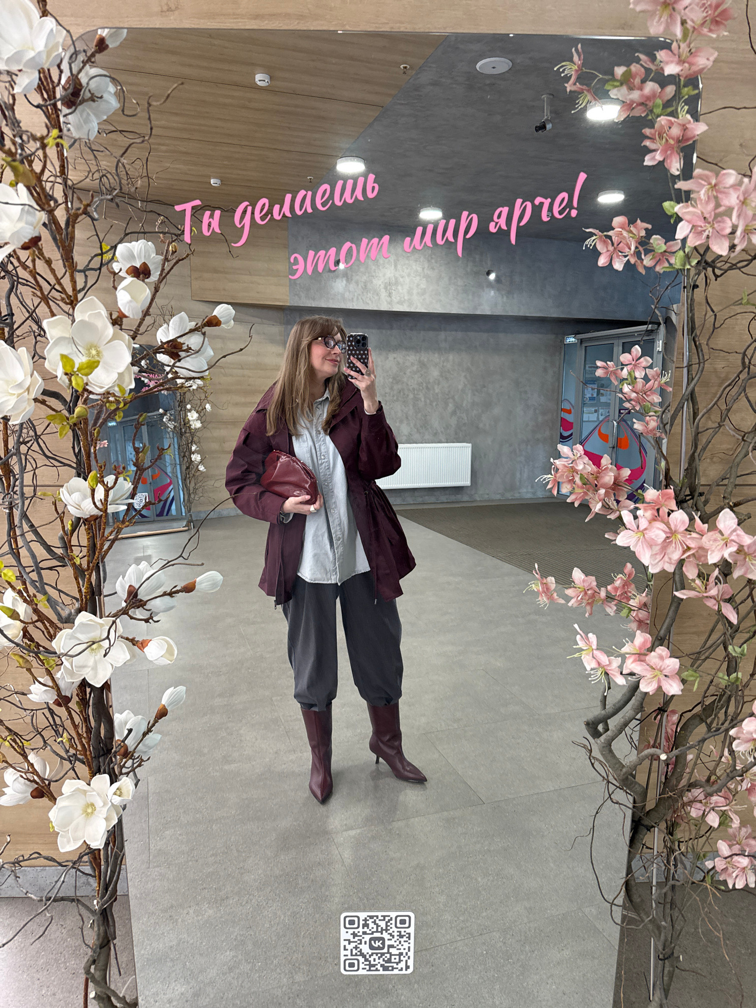 A woman is taking a selfie in a mirror decorated with floral arrangements. The mirror reflects an interior space with gray walls and floor. There are pink floral arrangements at the top of the mirror…read more