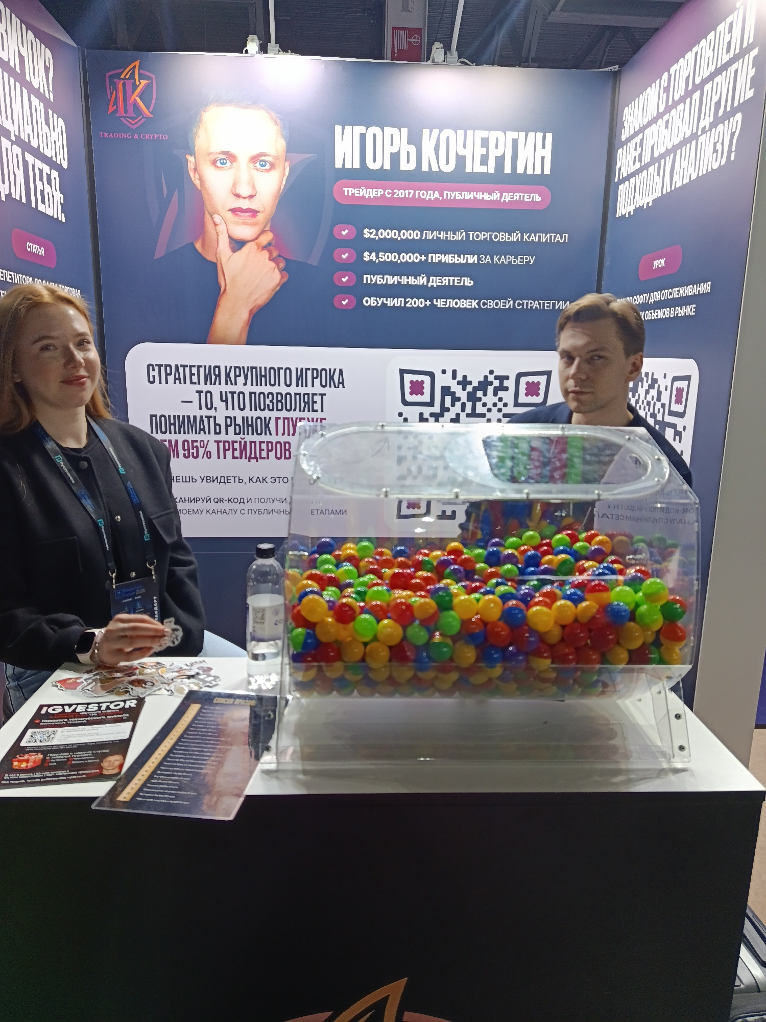 The image depicts a booth at a trade show or exhibition, featuring two individuals standing behind a table. A woman with red hair is on the left, wearing a black blazer and lanyard. A man is on the ri…read more