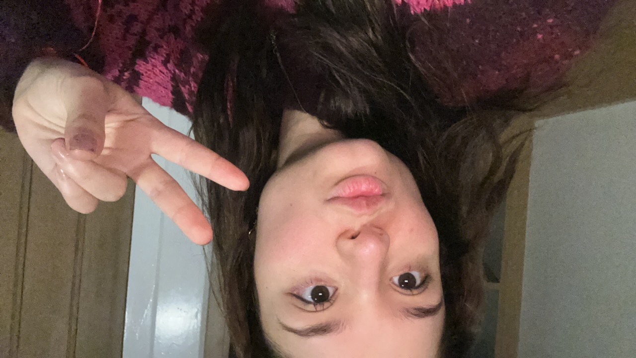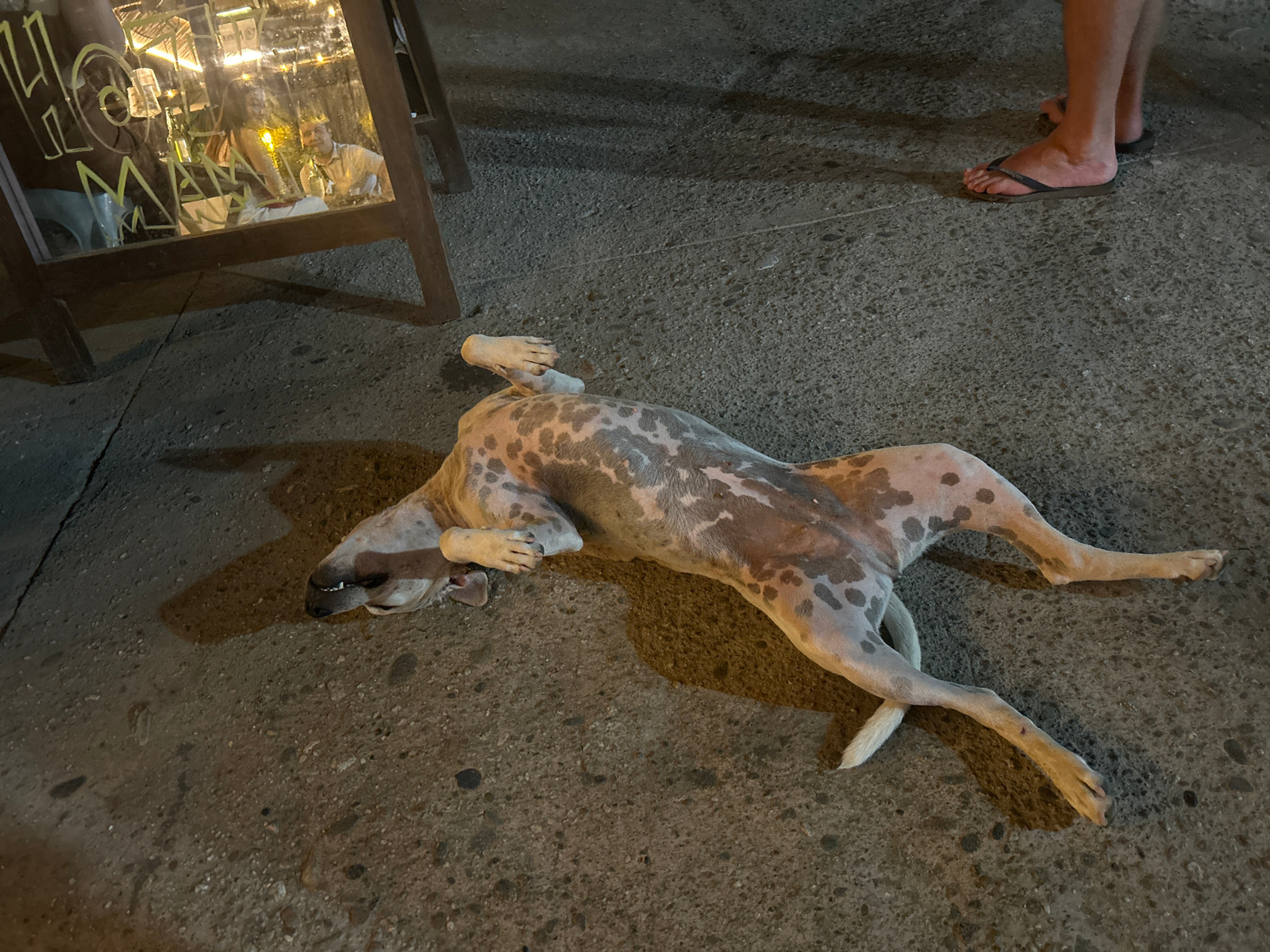 A dog, light-colored with dark spots, lies on its back on a paved surface. The dog’s legs are extended at various angles, and its head is resting on the pavement. To the left of the dog is a wooden fr…read more