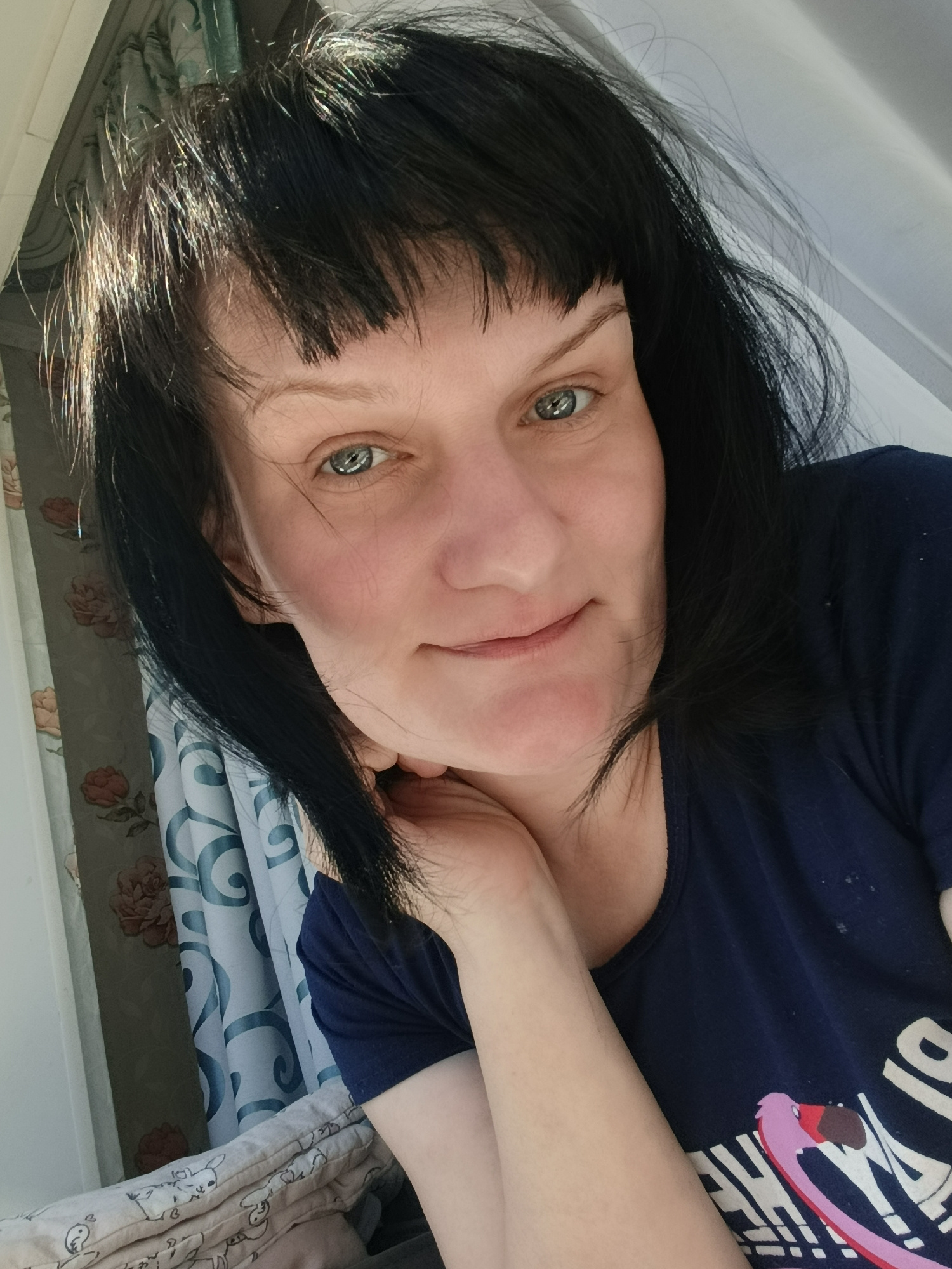A close-up selfie depicts a woman with short, dark hair, including bangs, and fair skin. She is looking directly at the camera with a slight smile. Her left hand is raised to her cheek, with her finge…read more