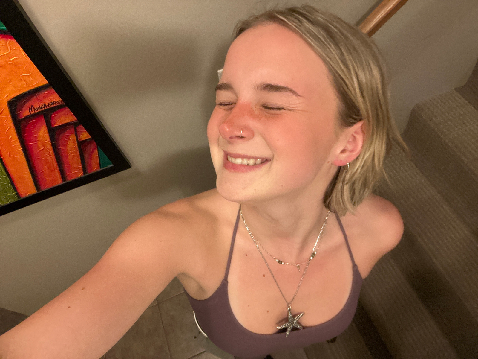 The image shows a woman with blonde hair, wearing a purple tank top and silver necklaces, smiling with her eyes closed. A piece of framed artwork hangs on the wall to her right. The location is presum…read more