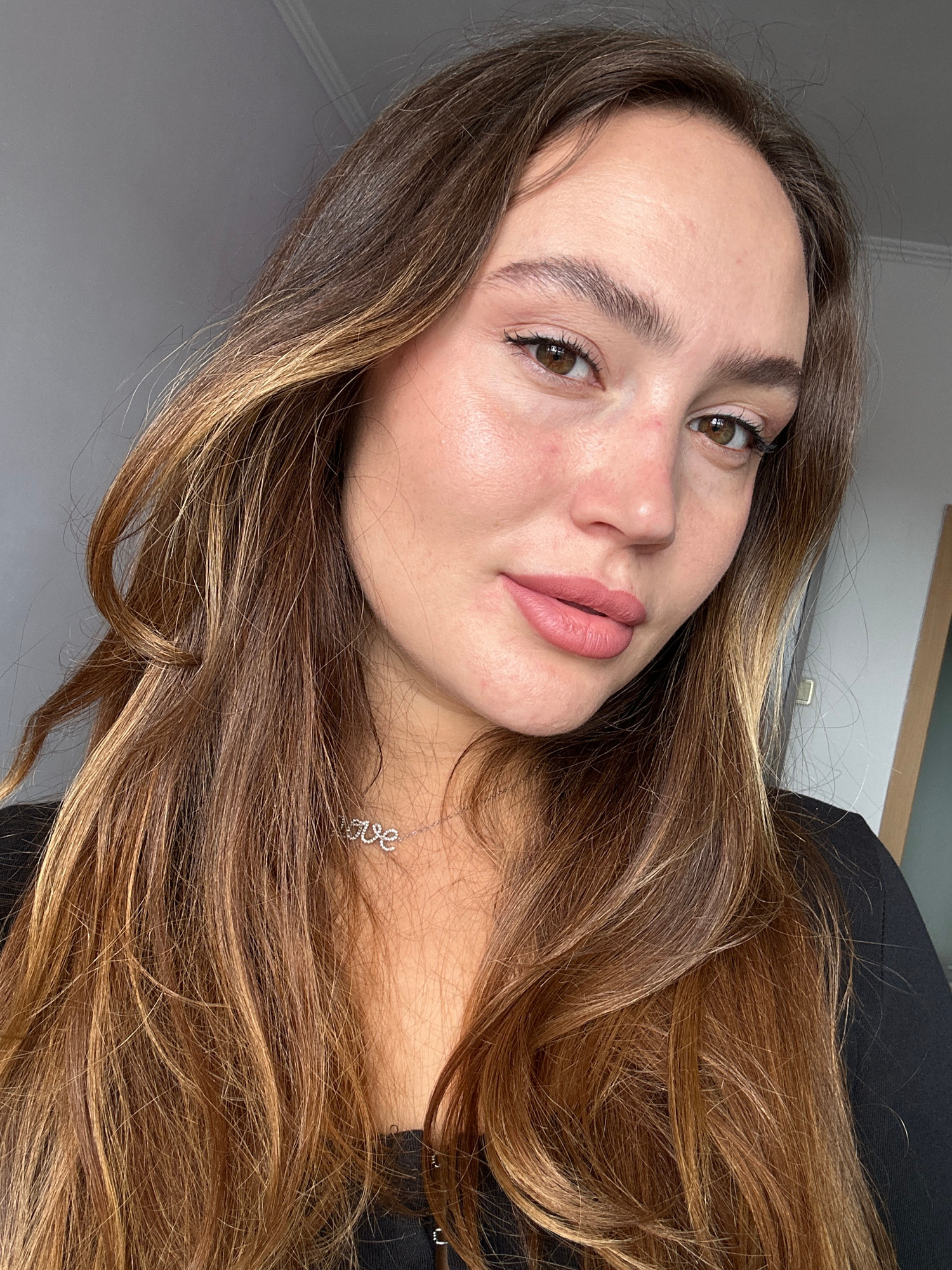 A portrait of a young woman with long, highlighted brown hair. She has light skin, brown eyes, and pink lipstick. She is wearing a black top and a silver necklace with a word pendant. The background i…read more
