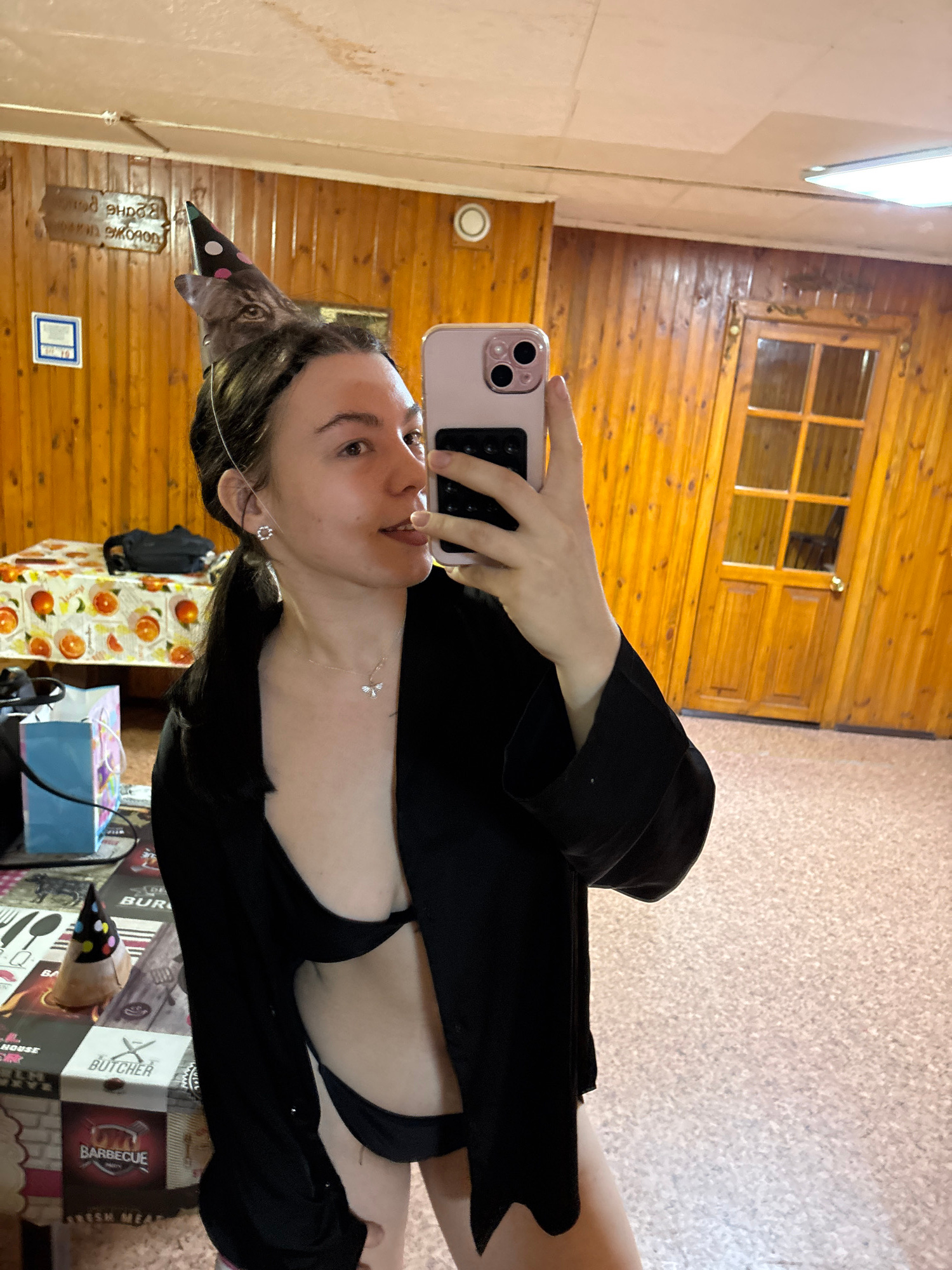 The image depicts a young woman taking a selfie in what appears to be an indoor setting. She is holding a pink smartphone with multiple lenses, partially obscuring her face. The woman has light skin,…read more