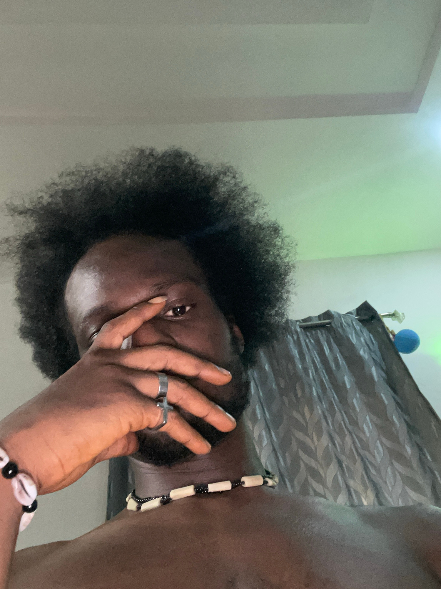 A close-up portrait shows a Black man with an afro covering part of his face with his hand. He has two rings on his fingers. He is wearing a beaded necklace and a seashell bracelet. The background inc…read more