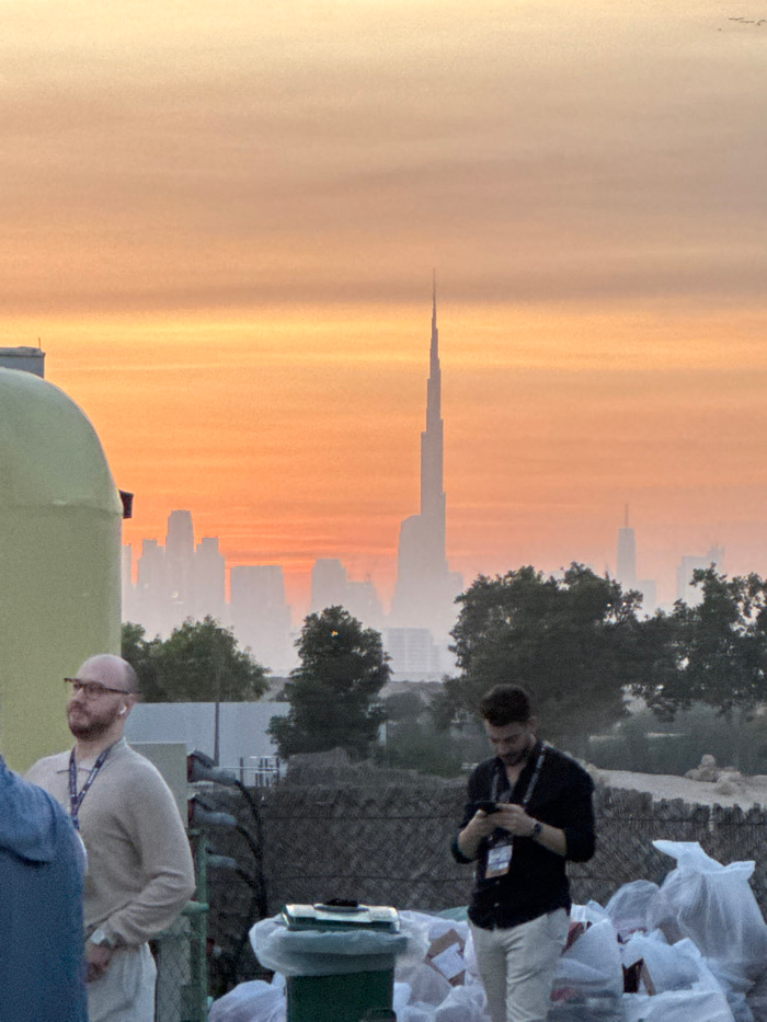 The image captures an outdoor scene in Dubai, United Arab Emirates, characterized by an orange and peach-toned sky indicative of sunrise or sunset. In the distant background, the hazy silhouette of th…read more
