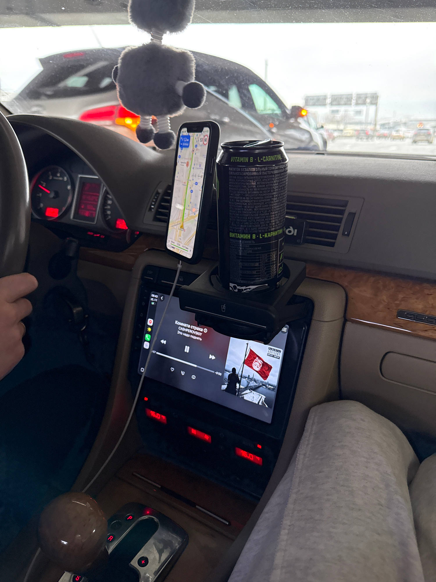 The image shows the interior of a car, likely an Audi given the emblem on the dashboard. The location appears to be a street in Moscow, Russia, based on the song playing on the in-car tablet by Russia…read more