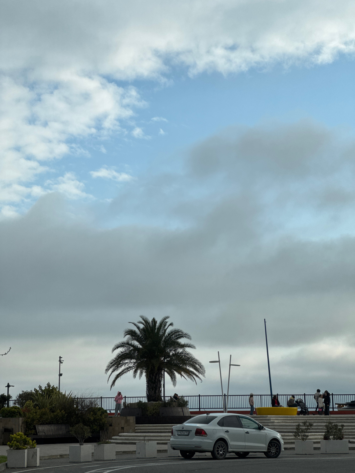 The image captures a scene in Sirius, Russia. A palm tree stands in the foreground, with a white car parked nearby. Behind the car, a group of people can be seen on a raised platform, possibly a boardβ¦read more
