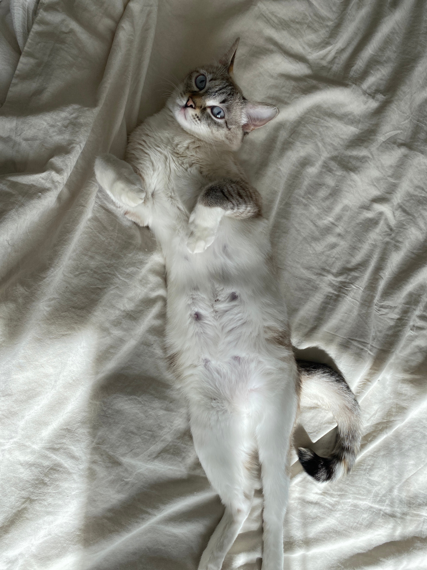 A light-furred cat with blue eyes lies on its back on a wrinkled white sheet. The cat's tail, which is striped in grey and black, is curved upwards. The scene is bathed in natural light. The cat appea…read more