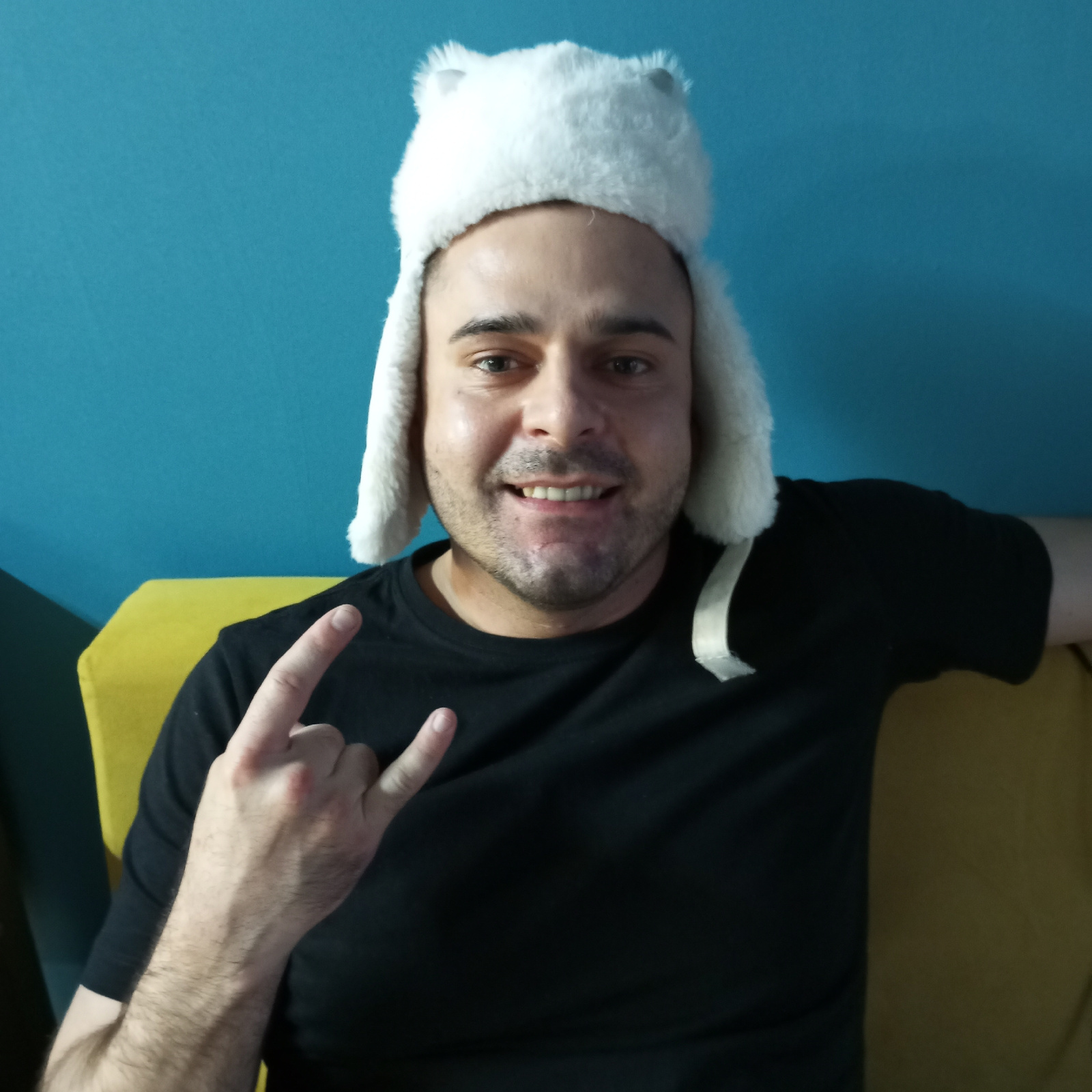 A person is sitting on a yellow sofa, wearing a black t-shirt and a white fur hat with ear flaps, and giving the "rock on" hand gesture. The background consists of a wall with two shades of blue. The…read more