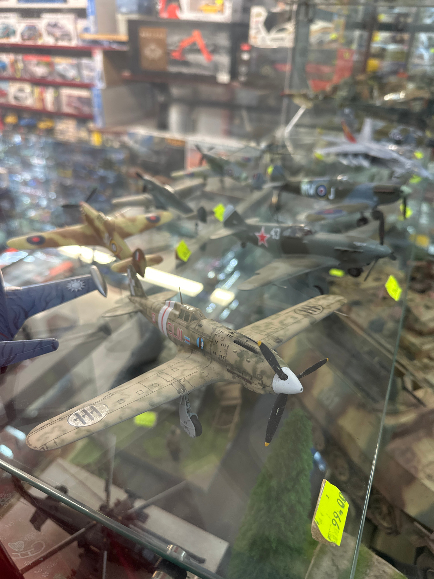 The image displays a collection of military aircraft scale models within a glass retail display case. In the foreground, a prominent Italian Macchi C.202 Folgore model, featuring a desert camouflage p…read more