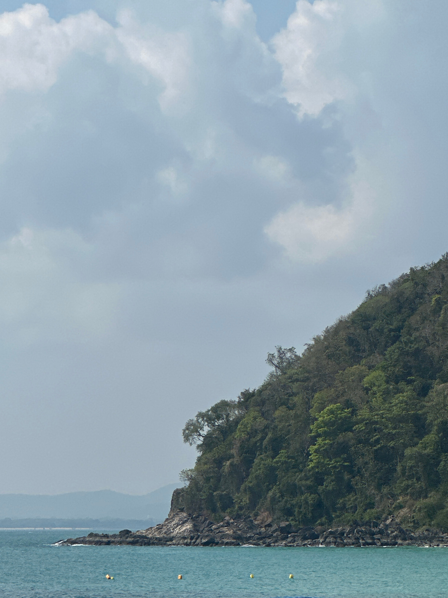 The image shows a coastal landscape in Ao Lukyon, Thailand. A lush, steep hillside covered in trees dominates the right side of the frame, bordering the sea. The sea appears calm and a few yellow buoy…read more