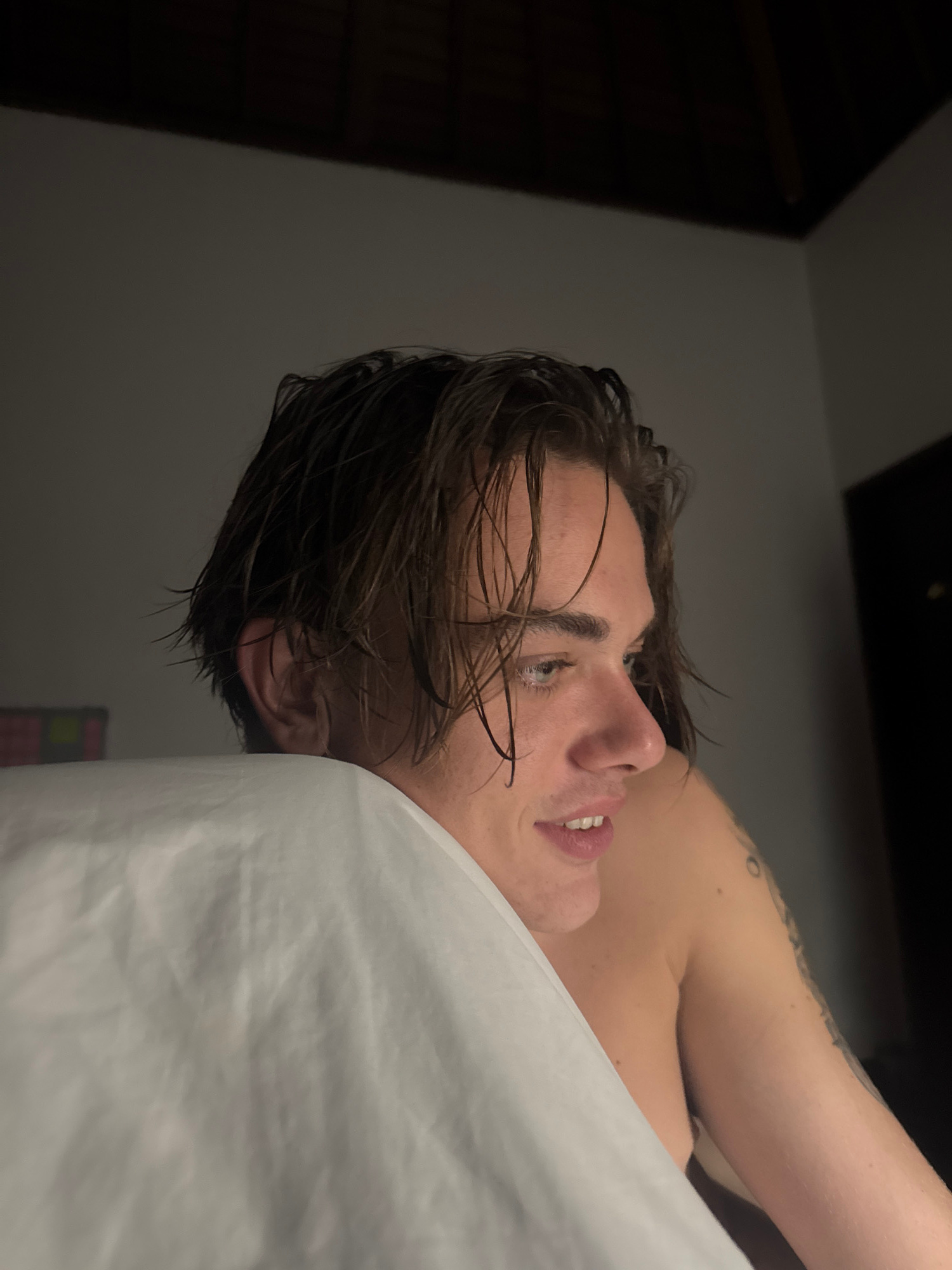 A close-up, rotated shot captures a young person lying on their side in what appears to be an indoor setting, possibly on a bed or massage table covered with a white sheet. The individual, with long,…read more
